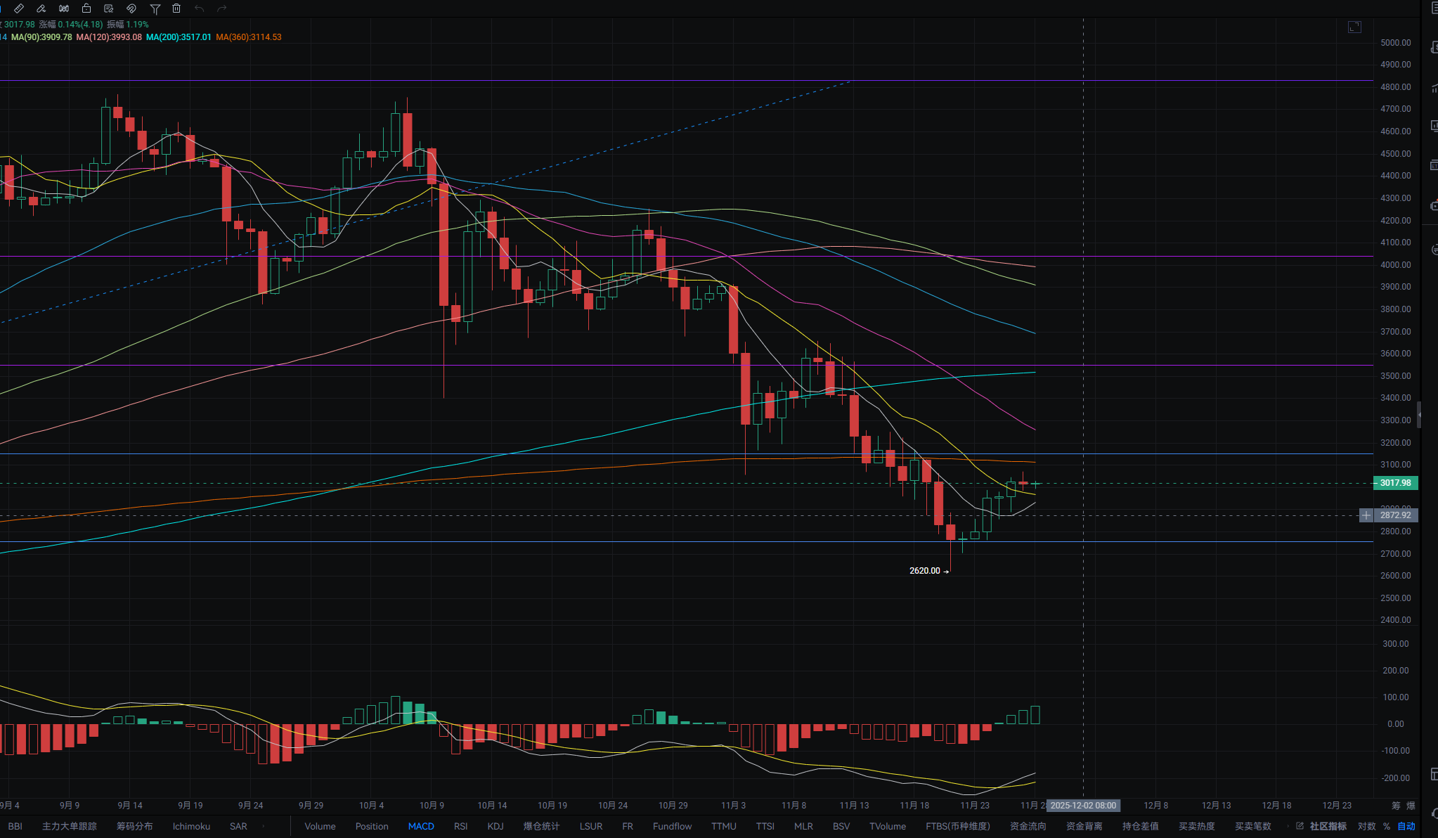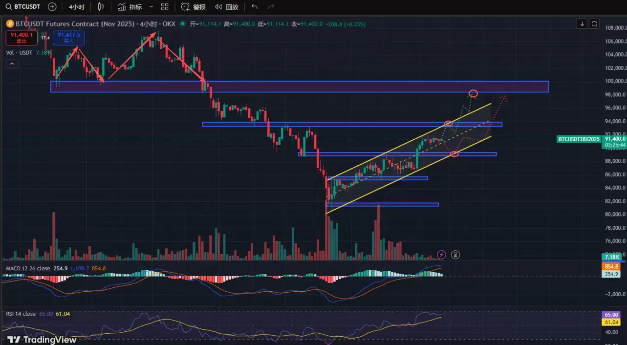 市场延续了美联储对于12月降息的预期,投资者的情绪逐渐的好转,在没有新数据的日子现在可能是最轻松的,就连大饼的价格在本周内都有继续上涨的可能,毕竟明天是黑五,也只有半天,估计也翻不出什么花,然后就是周末了。本周阳包阴形态,关键看94000附近能否收复形成强势反包 ,否则可能大概率整理结构;日线方面来到关键阻力区域91500-94000区域,如果成功突破下降趋势线压力93500附近(下降趋势线 + 布林带中轨),技术上有反转的大概率,继续挑战第二压力97500–100500区域(M顶颈线+ POC 套牢区);日线指标 MACD、RSI 金叉,指向 继续上行 ;短线级别关注4小时,短线机会伺机而动短线方面,4小时级别,继续震荡上行,回踩上升通道的中轨区域不跌破,有概率直接不回调直接上冲93500-94000压力(整理平台压力),下个压力98000附近(M顶颈线压力) 如果回调,关注通道下轨89500附近(也是矩形整理的上沿支持),不跌破,维持上升通道继续;跌破看矩形下沿支撑; 更小级别1小时,留意矩形整理平台A区,上下都可能出现真假跌破的M区,走AMD形态  指标方面,macd和rsi都有修复向上,支持向上反弹;