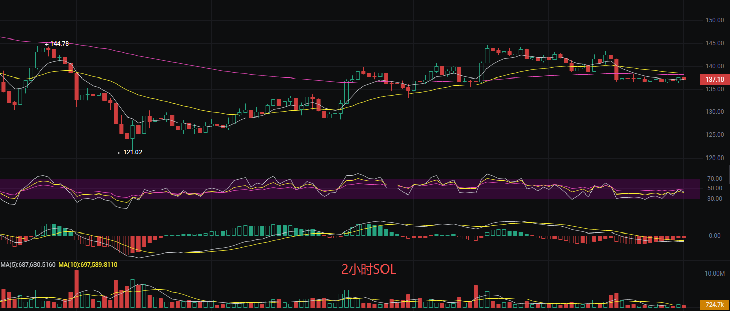 The current price of Solana is 137.1. Liying assesses that the current SOL market is in a range-bound oscillation pattern, with the price close to the strong support level of 130.1, which is a previous low and holds significant technical meaning. At the same time, a bullish engulfing pattern has appeared on the technical chart, suggesting a potential rebound in the short term. However, the upward space may be limited, and close attention should be paid to the performance of the strong resistance level at 137.1.