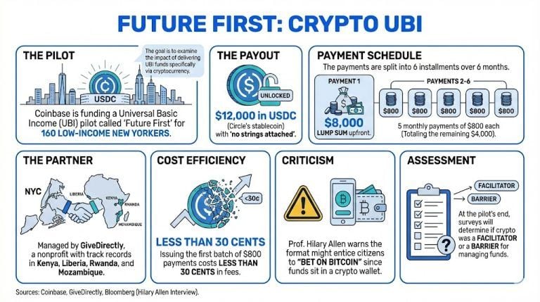 Coinbase资助了一项名为“未来优先”的普遍基本收入(UBI)试点,旨在为低收入公民提供加密货币的财务支持。