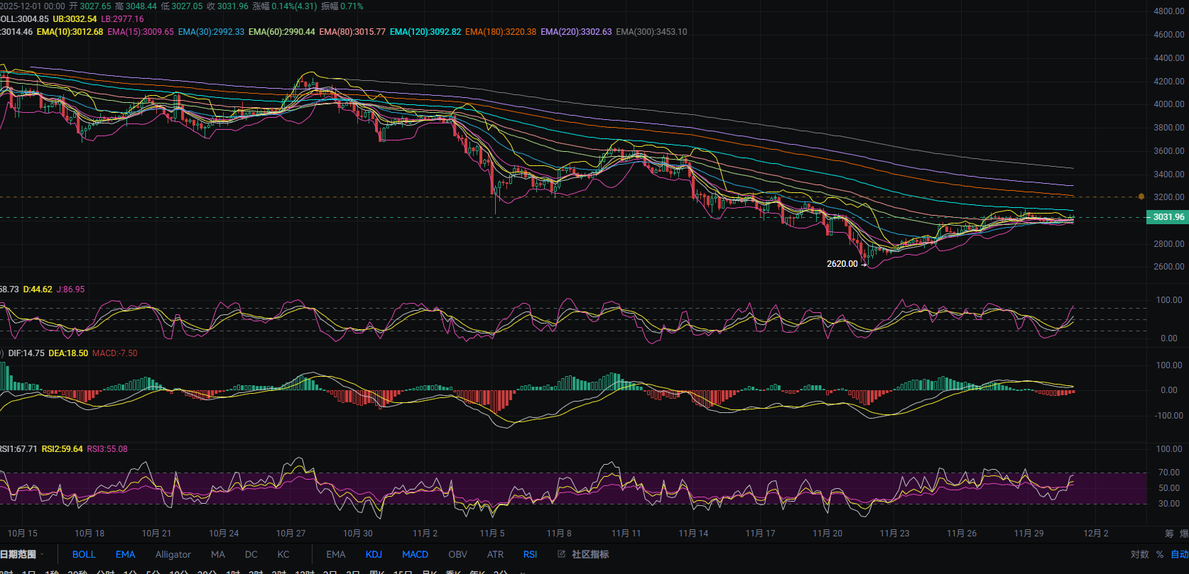 今日以太坊建议做多点位一:3010下方轻多,止损2950下方;目标3040-3085-3035!破位3140-3160可以继续持有!多单具体入场机会可以关注历辉实时更新!