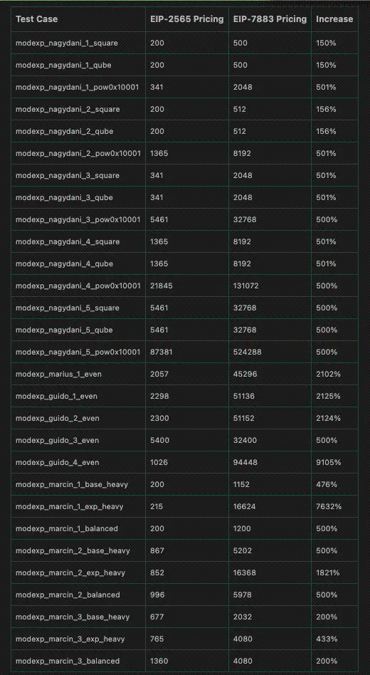 为了解决这个问题,以太坊需要调整 ModExp 的定价公式,使 Gas 消耗能够准确反映客户端实际完成的工作量。因此,EIP-7883 引入了新的规则,提高了最低 Gas 成本、提高了总 Gas 成本,并使输入数据量较大的操作(尤其是超过 32 字节的指数、底数或模数运算)更加昂贵,从而使 Gas 定价与实际所需的计算量相匹配。