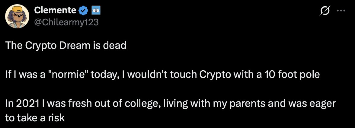 这也是为什么市场情绪的变化如此一致的原因。如果一个市场不再提供广泛、清晰的获胜路径,整体情绪会逐渐恶化。在一个中位数参与者的体验是“我只是别人的流动性”的市场中,犬儒主义往往是理性的。