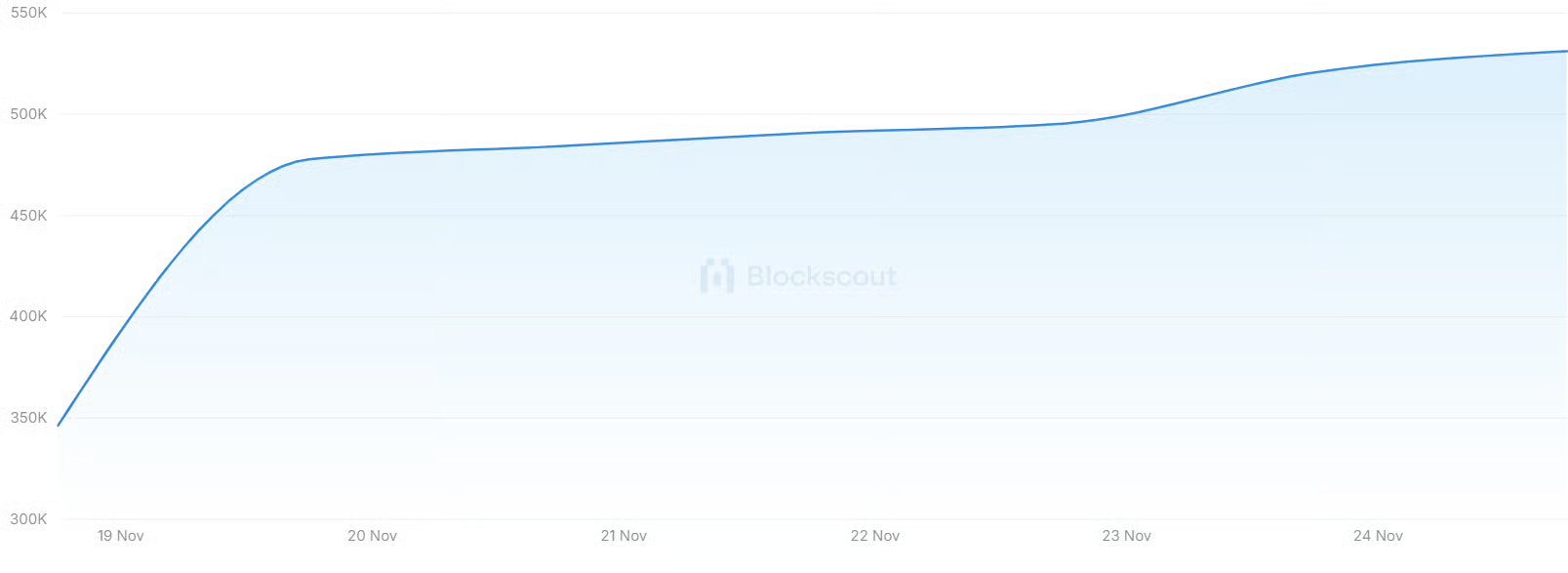 The Gensyn public testnet processed over 500,000 transactions in a single day, continuously rising from about 350,000 in less than a week. The total transaction volume has now exceeded 84 million, serving over 155,000 users.