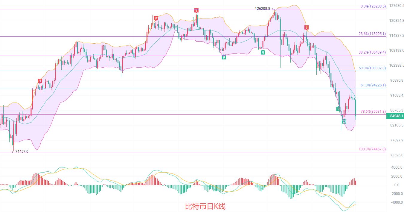 Before the article was published, the highest price was 90,400, and the lowest was 83,786. After about ten days of market movement, the previous bullish trend has been smoothed out in just one day. The door has ultimately opened. Pay attention to the EMA15 trend fast line at 90,500. The MACD volume is decreasing, and the DIF and DEA are contracting. The K-line is crashing down from the Bollinger Band middle line at 90,900 towards the lower Bollinger Band at 82,000, and the KDJ is forming a death cross downward.