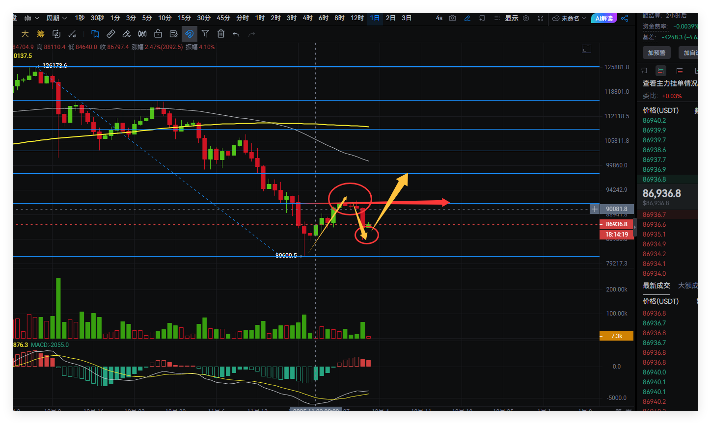 After the previous decline, we mentioned that the market had reached a major bottom and would rebound, peaking at 93,081. Subsequently, there was a rapid decline yesterday, with the current low at 83,777. Ethereum rebounded to 3,099, and the low yesterday was at 2,718. Don't panic during the decline; it's a normal correction, and a correction is an opportunity to go long.