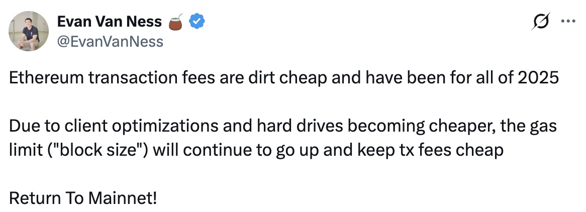 「以太坊的交易费用非常低廉,而且在 2025 年全年都如此。由于客户端优化和硬盘价格下降,gas 限制(「区块大小」)将继续提高,从而保持交易费用低廉。回归主网!」