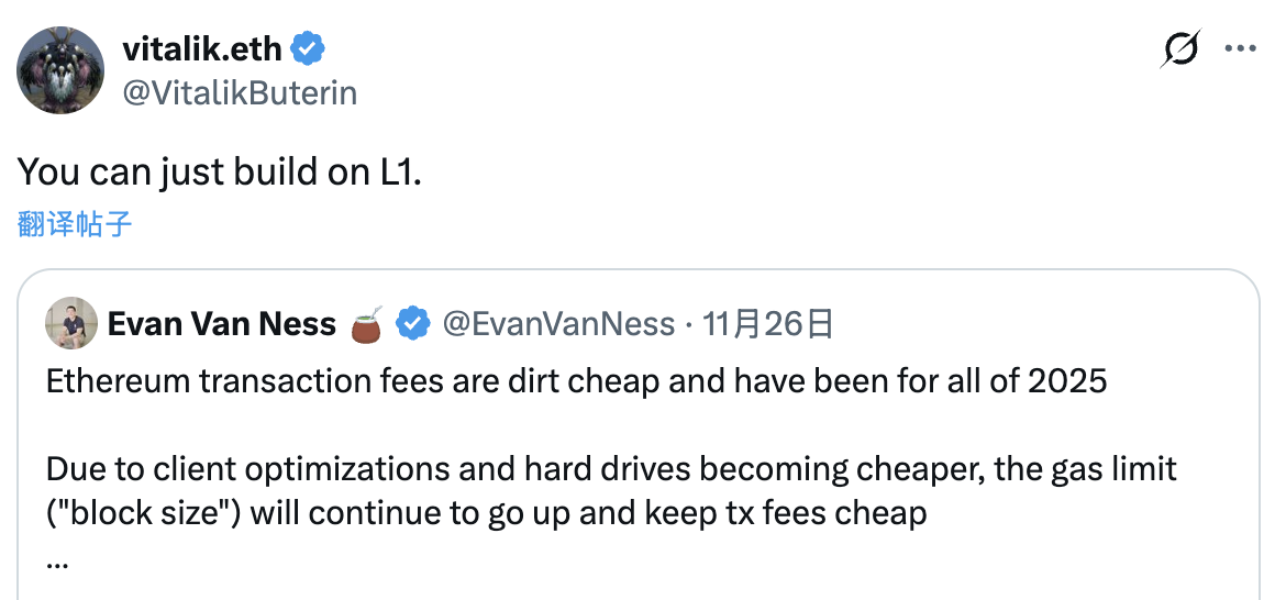 随后在 12 月 1 日,Vitalik 转发了这条讨论,并语气简洁地补了一句:「You can just build on L1.」他没有进一步解释,但这句评论已经足够引爆行业情绪。