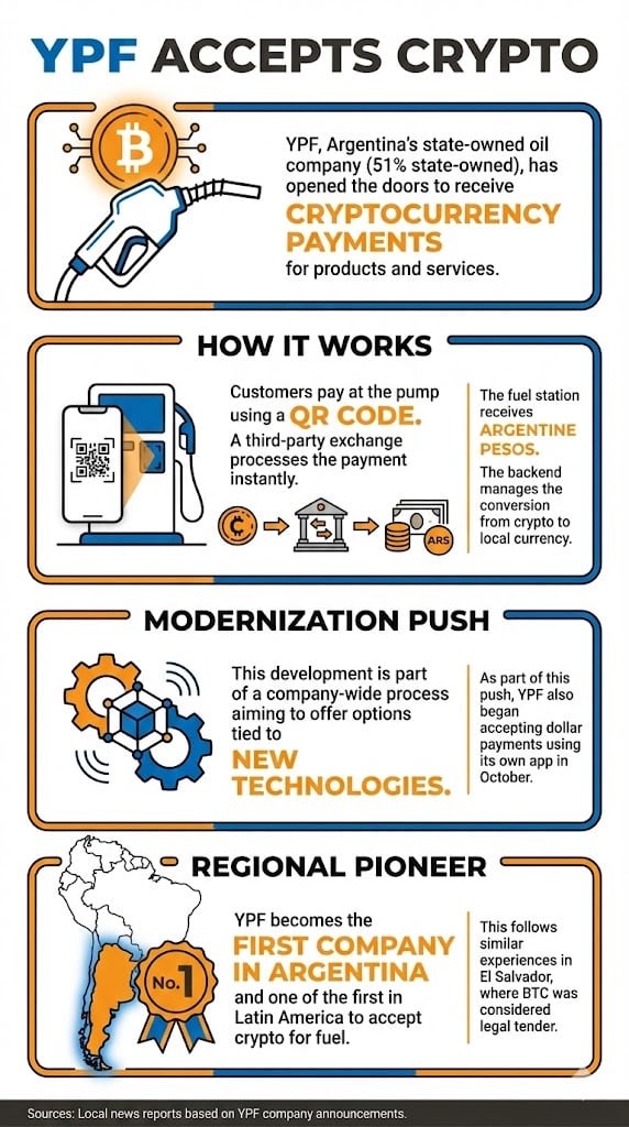 YPF becomes the first company in Argentina and one of the first in Latin America to accept cryptocurrency payments for fuel, following similar experiences in El Salvador, where Bitcoin was considered legal tender.