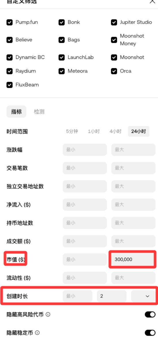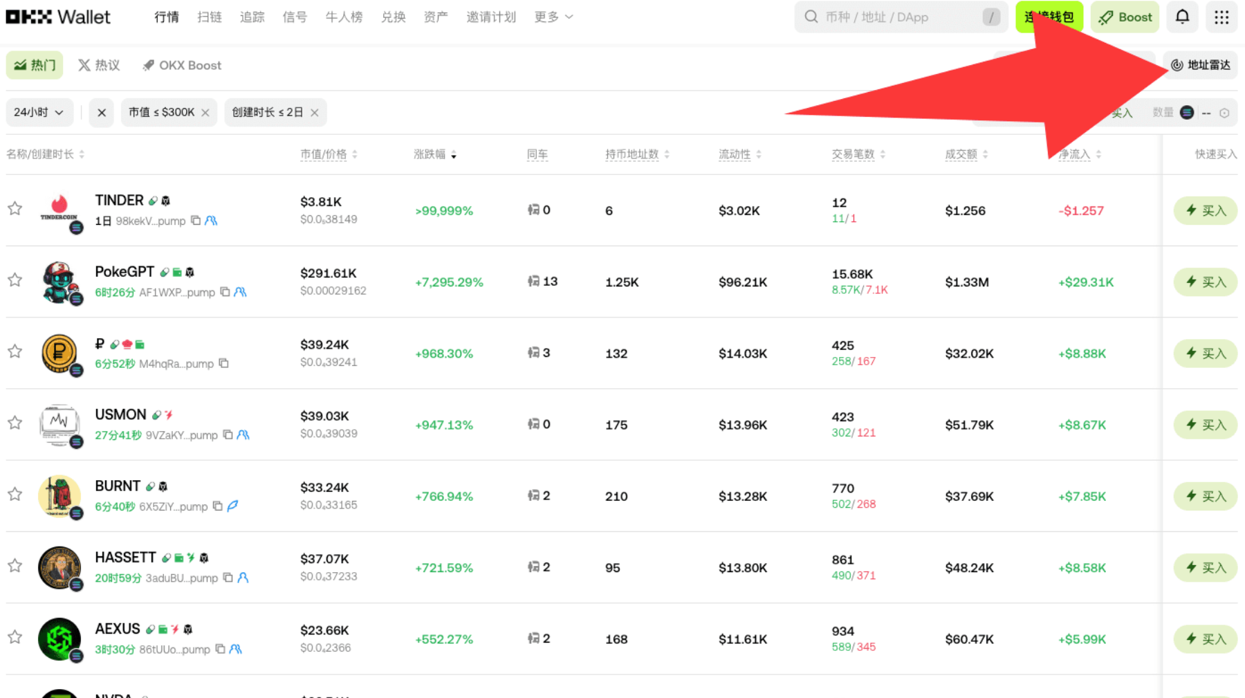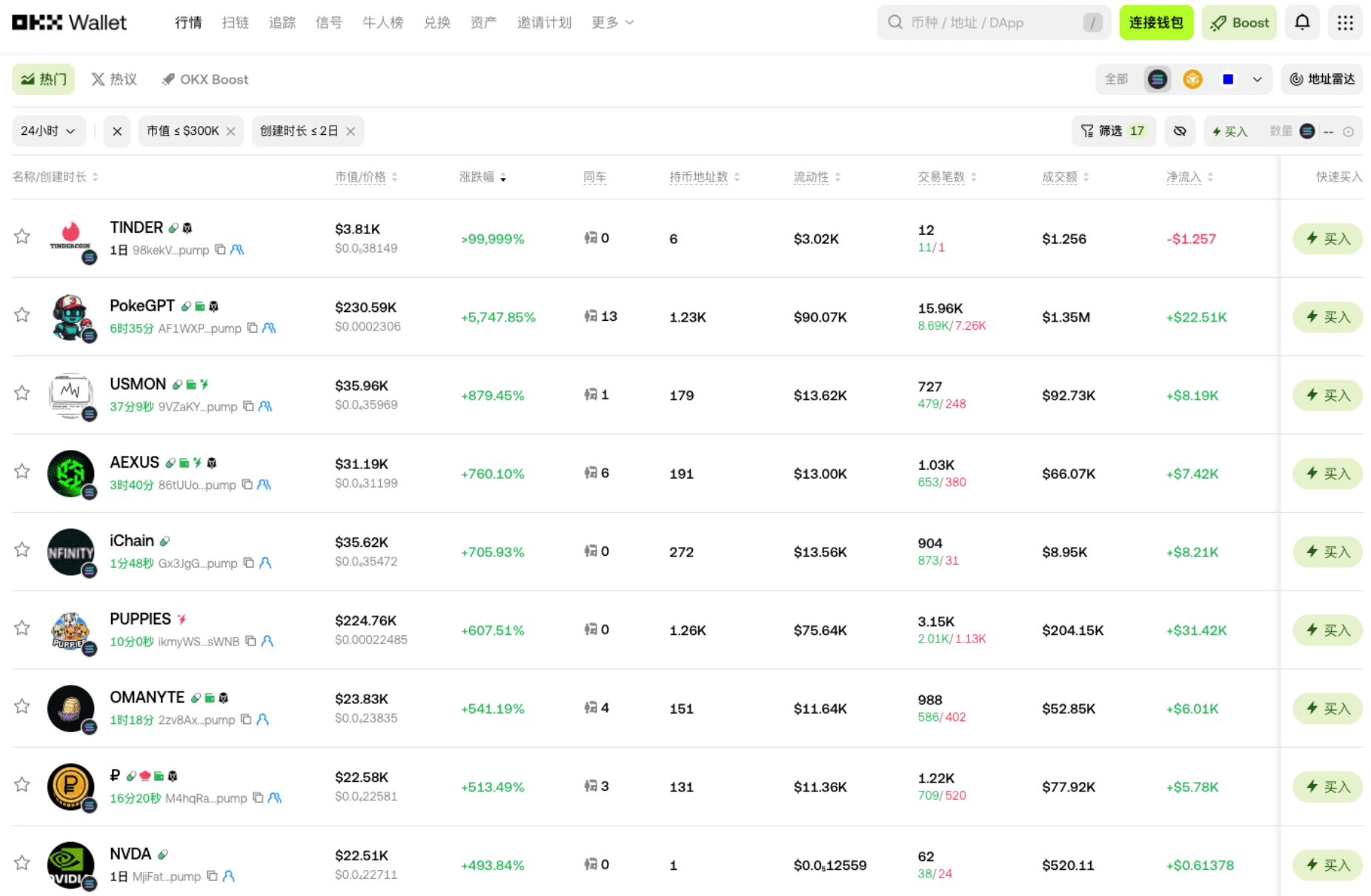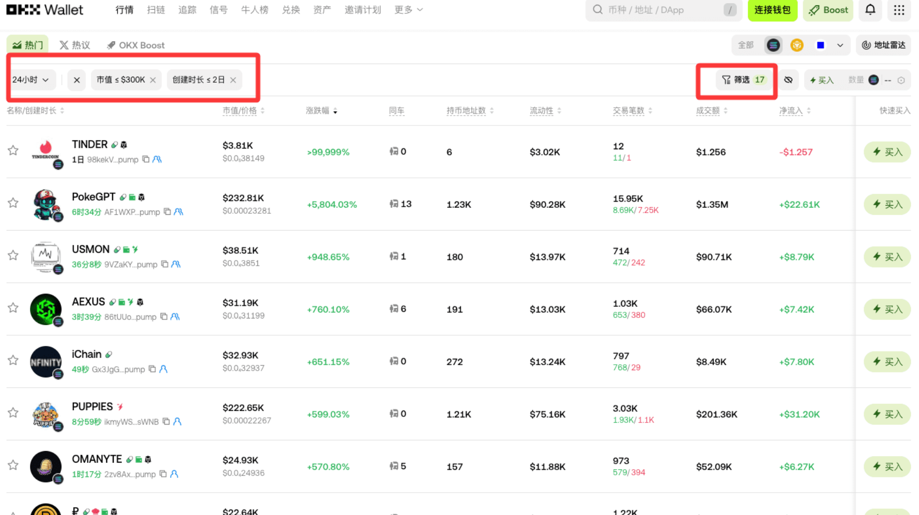 咱们第一步先启动雷达做初步筛选:打开 OKX 钱包网页,在行情榜单里找热门 MEME 币,筛选标准记好啦 —— 上线 1-2 天、流通市值在 30K 到 10M 美金之间,这都是 “金狗” 的典型特征。