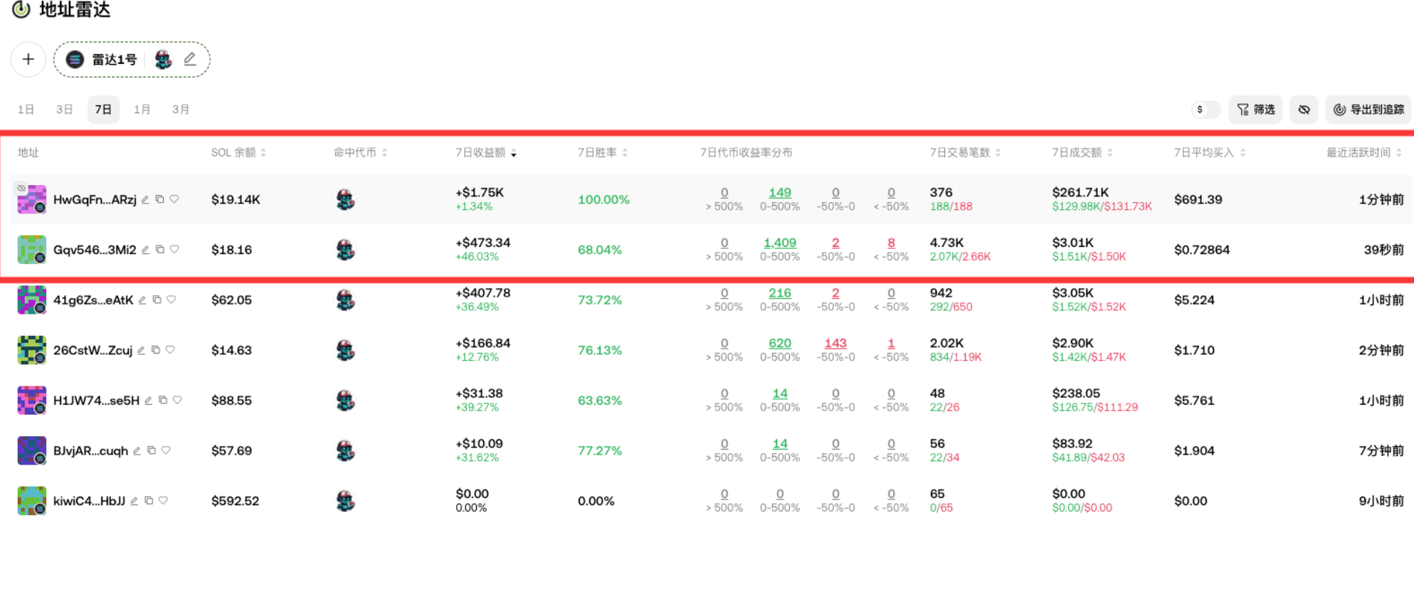 先给大家唠唠地址雷达的核心逻辑,说白了特别简单:它不搞花里胡哨的,只盯着一个关键点 —— 那些能精准踩中市场逆转、埋伏早期金狗或低位布局的地址。用人话讲就是,你输入一个热门 MEME 币,它能自动扫遍全市场,找出所有买了这个币还赚得盆满钵满的地址。