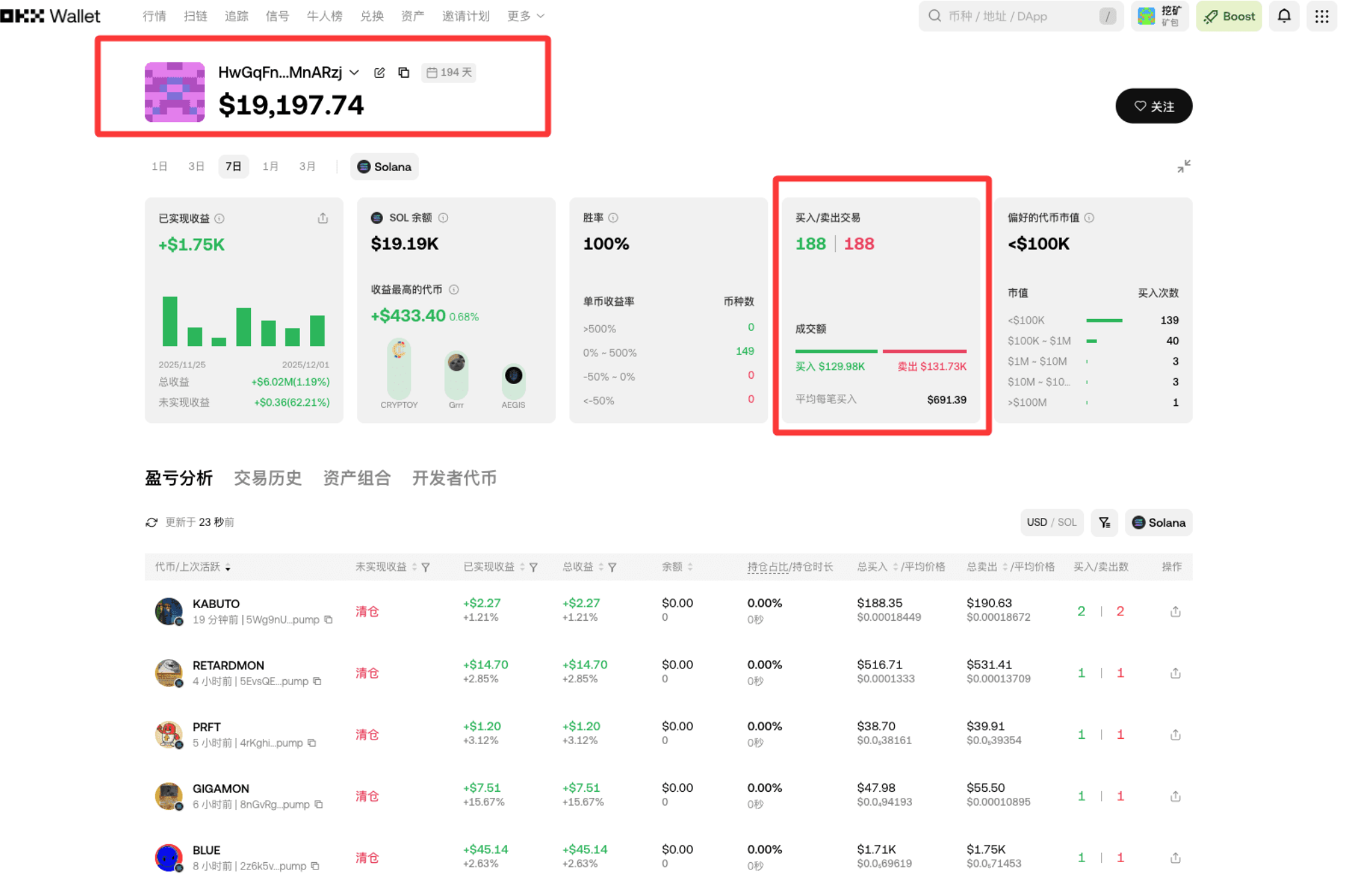 点击确认后,结果秒出来,居然直接挖到一个 100% 胜率的聪明钱地址