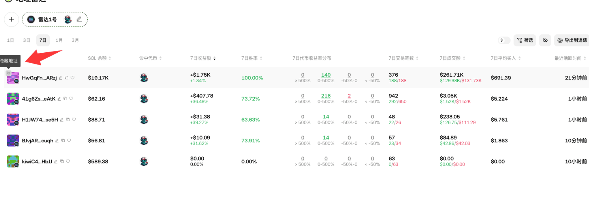 像刚才筛出来的几个地址,有个几天交易破千笔的,直接隐藏过滤掉,这种 “工具人地址” 跟了只会浪费时间。