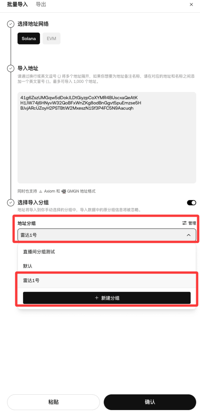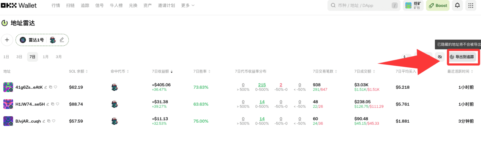 最后一步,把精筛出来的优质地址导入追踪系统!选中那些胜率高、有余额、活跃度达标的地址,导入后起个专属名字