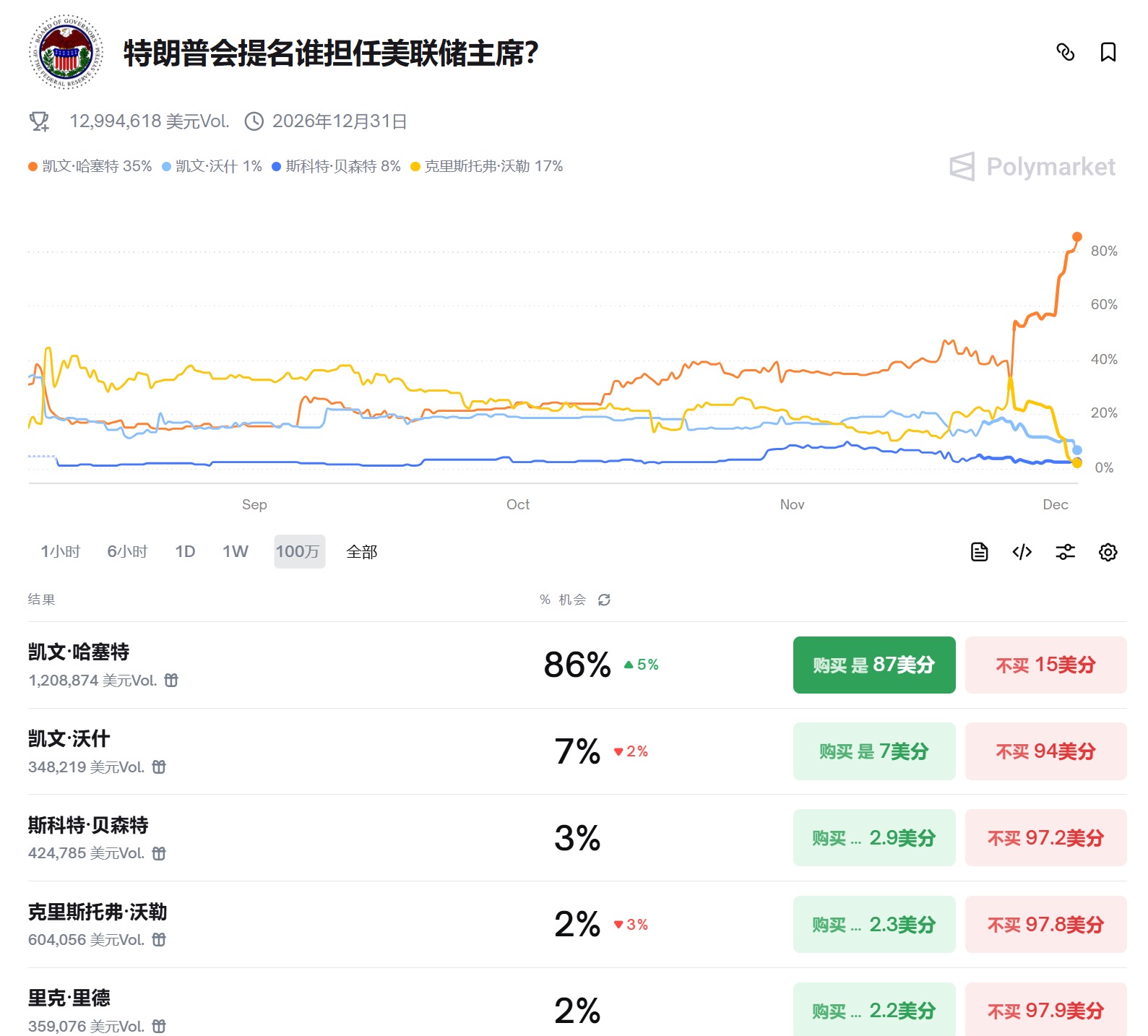 Polymarket预测其提名概率已提升至86%,若成真,美联储政策或转向全面宽松。即便其他人选上台,特朗普团队筛选的候选人均倾向友好政策,美联储与加密货币的对抗周期可能宣告终结。