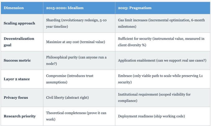 以太坊已经从哲学上的纯性转向有了可部署的解决方案,用可测量的安全属性取代了抽象的去中心化,并为支持数万亿美元的经济活动做好了基础设施准备。