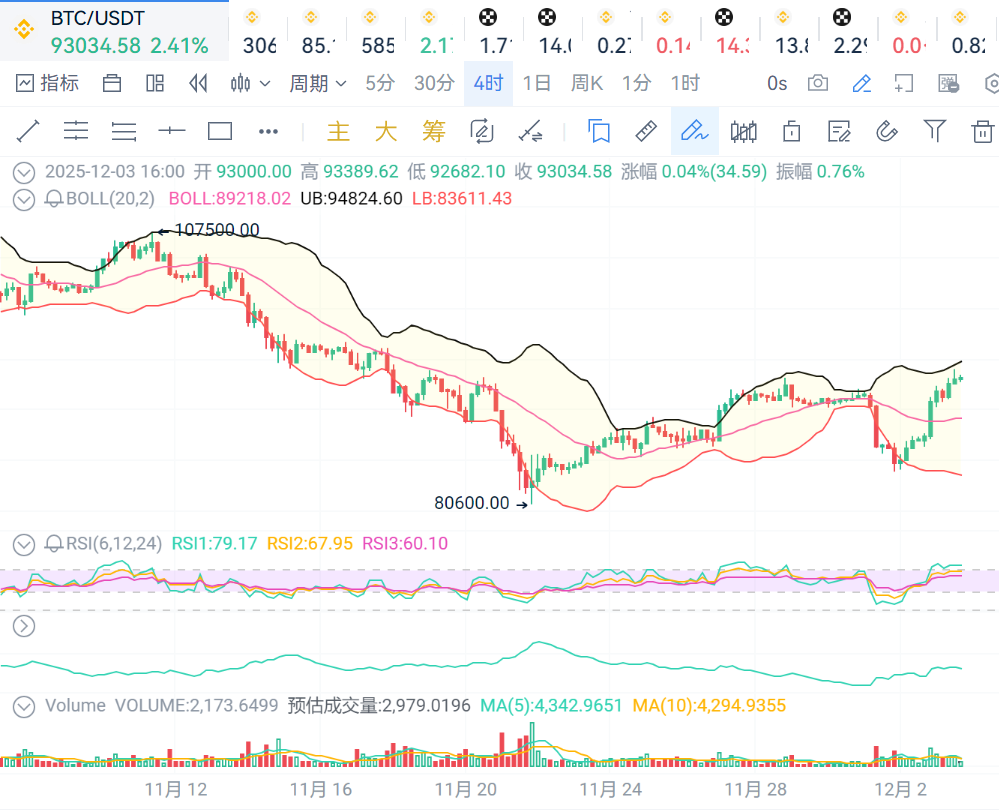 BTC:4小时级别看,价格继续保持在布林线中轨之上,短线行情超买,可以适当减仓止盈抄底的部分。