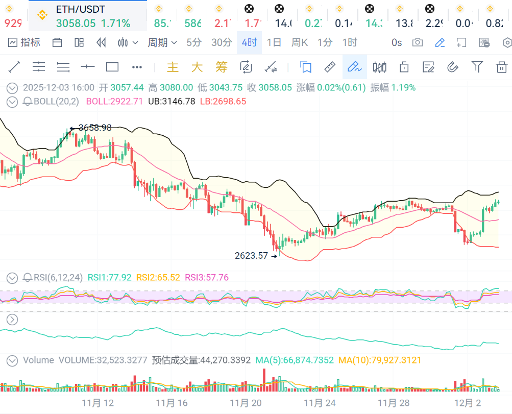 ETH:4小时级别看,价格继续保持在布林线中轨之上,价格走势依旧健康,短线行情超买,可以适当减仓止盈部分,支撑位3050,压力位3070.
