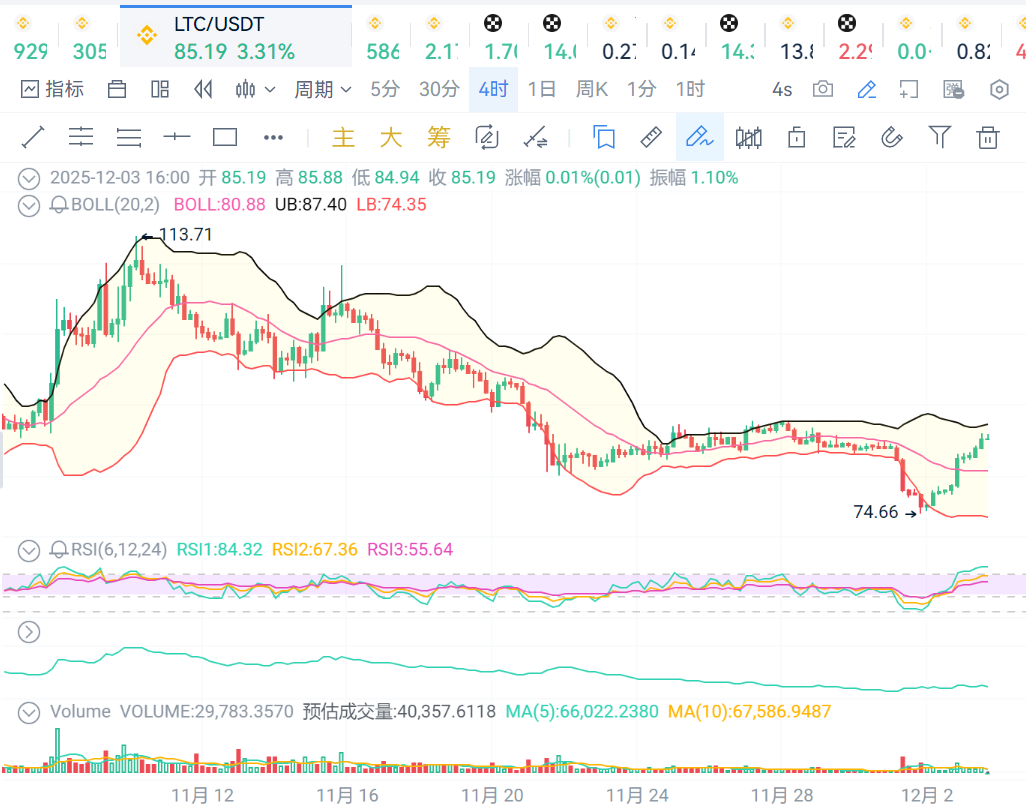 LTC:价格继续保持在布林线中轨之上,价格走势依旧健康,短线行情超买,可以适当减仓止盈部分。