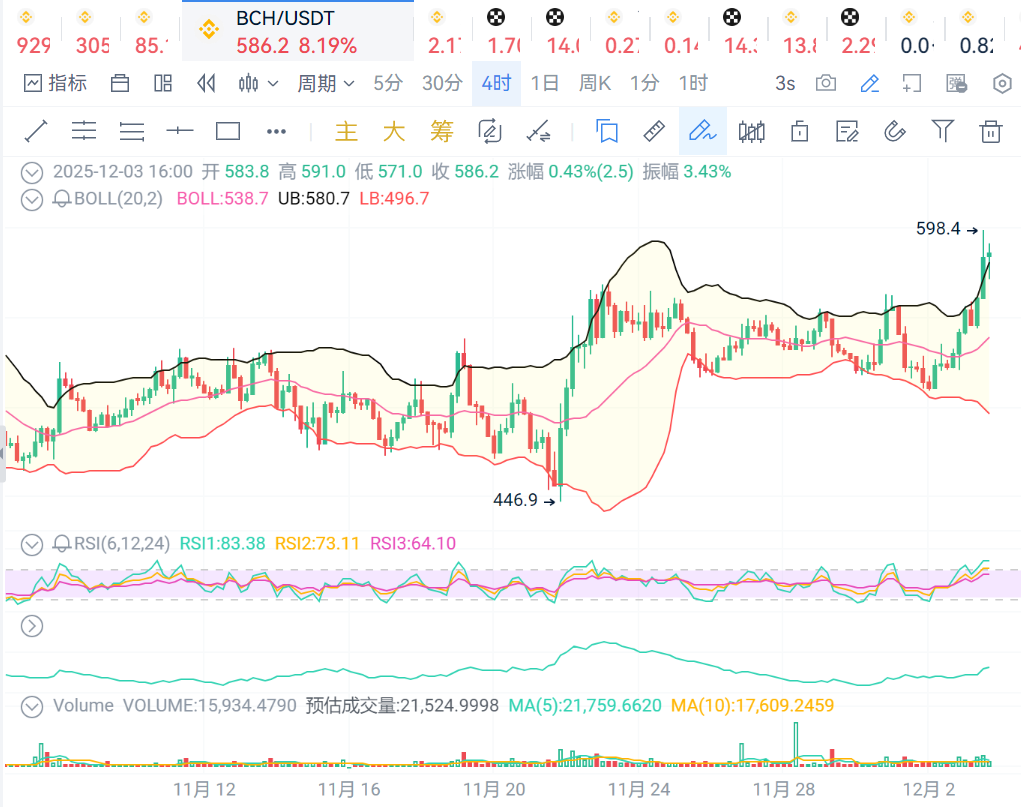 BCH:价格继续保持在布林线上轨附近,价格走势强势,短线行情超买,可以适当减仓止盈部分,支撑位570,压力位600.
