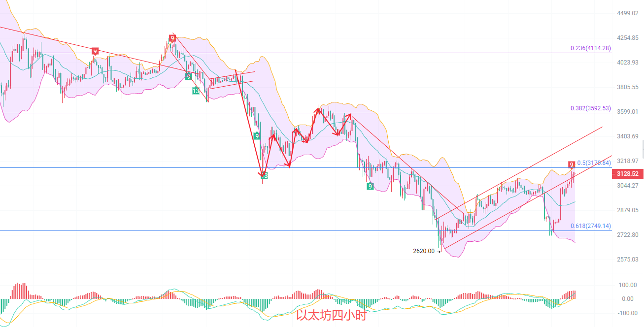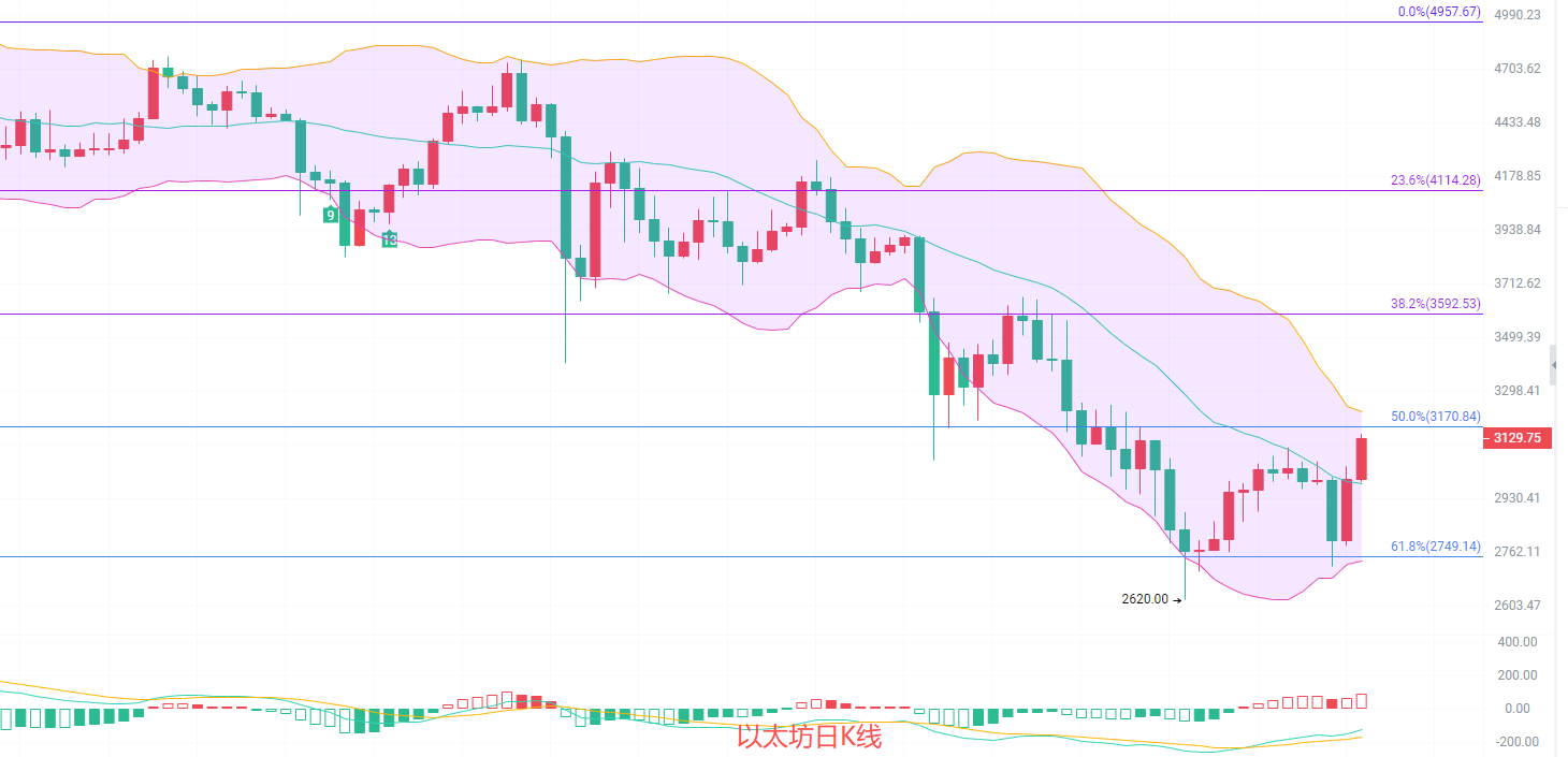 日K线发稿前破了前高3100,最高已经抵达了3145,最低2980正在冲击黄金分割线0.5阻力位3170,和EMA30交汇点3170,两个位置重合形成的双阻力位,MACD连续放量增筹,KDJ死叉被扳回向上成金叉扩散趋势,布林带上轨阻力位关注3222,中轨关注2980,行情不会一直走单边,错过北上的币友别急,等下一波回调