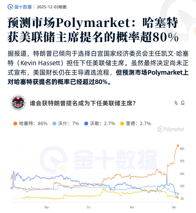 ⚡️Polymarket data shows that the probability of Hassett being nominated as Federal Reserve Chairman is over 80% ——