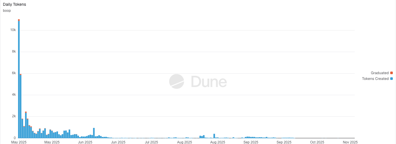 boop.fun 5 月 1 日推出时,平台单日 Meme 币创建数量达 10877 个,超越了 pump.fun。但此后便每况愈下,据Dune数据,boop.fun 虽然还没有“倒闭”,但过去 24H 发射的 Meme 币仅 1 个。而 BOOP 代币的市值现在已跌至 800 万美元。