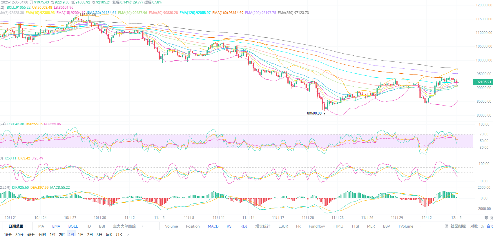 比特币现价92100附近。比特币4H中晚间行情承压EMA160线走出回踩下插EMA30-EMA60区间形成较长下影线,目前行情位于EMA120位置,BOLL通道也是出现收口,上轨正在下压,中下轨抬头姿态不变,MACD中绿柱再次缩量接近于0轴位置,DIF与DEA在金叉后首次收口有望形成死叉,RSI三线下行接近40,KDJ三线交叉向下扩散接近30,说明回踩行情还未走完,下方继续看EMA60与90000关口作为重要支撑,不破可以考虑多单介入,上方可以关注EMA160与EMA200区间不破高空入场!日图中也是给到关键承压EMA30,中轨在90000附近作为多头支撑,在KDJ与RSI中都存在高位拐头下行,说明回踩需求存在!