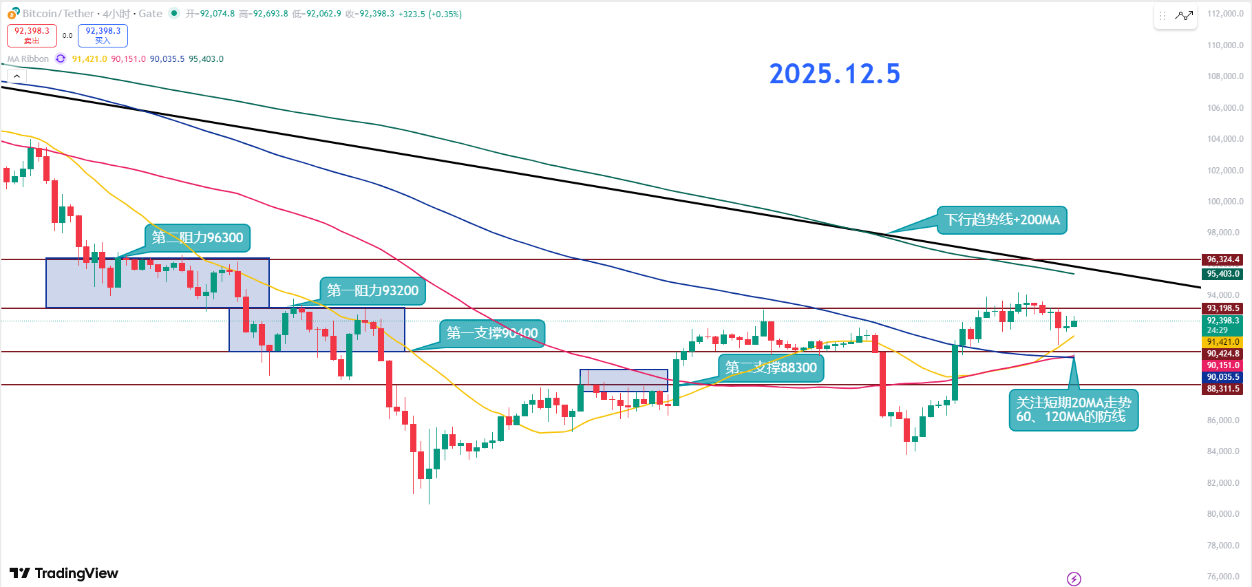 The second support at 88.3K, if it drops down to here, we will see this level; if it breaks here, it will be troublesome. The first resistance at 93.2K is the upper edge of the pressure zone that must be broken in the short term; if it doesn't break, we will see oscillation.