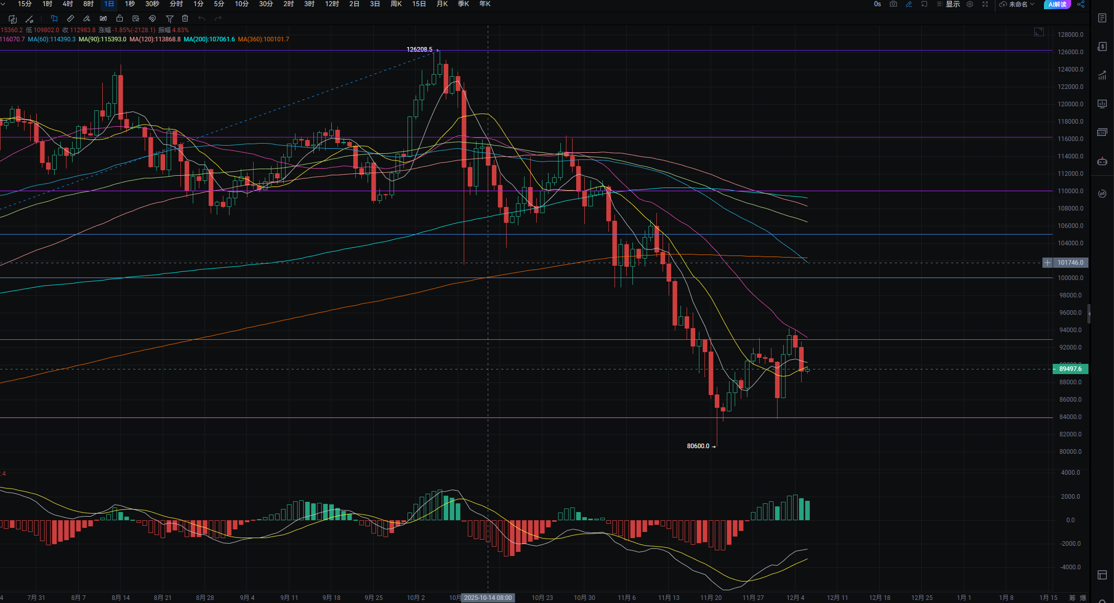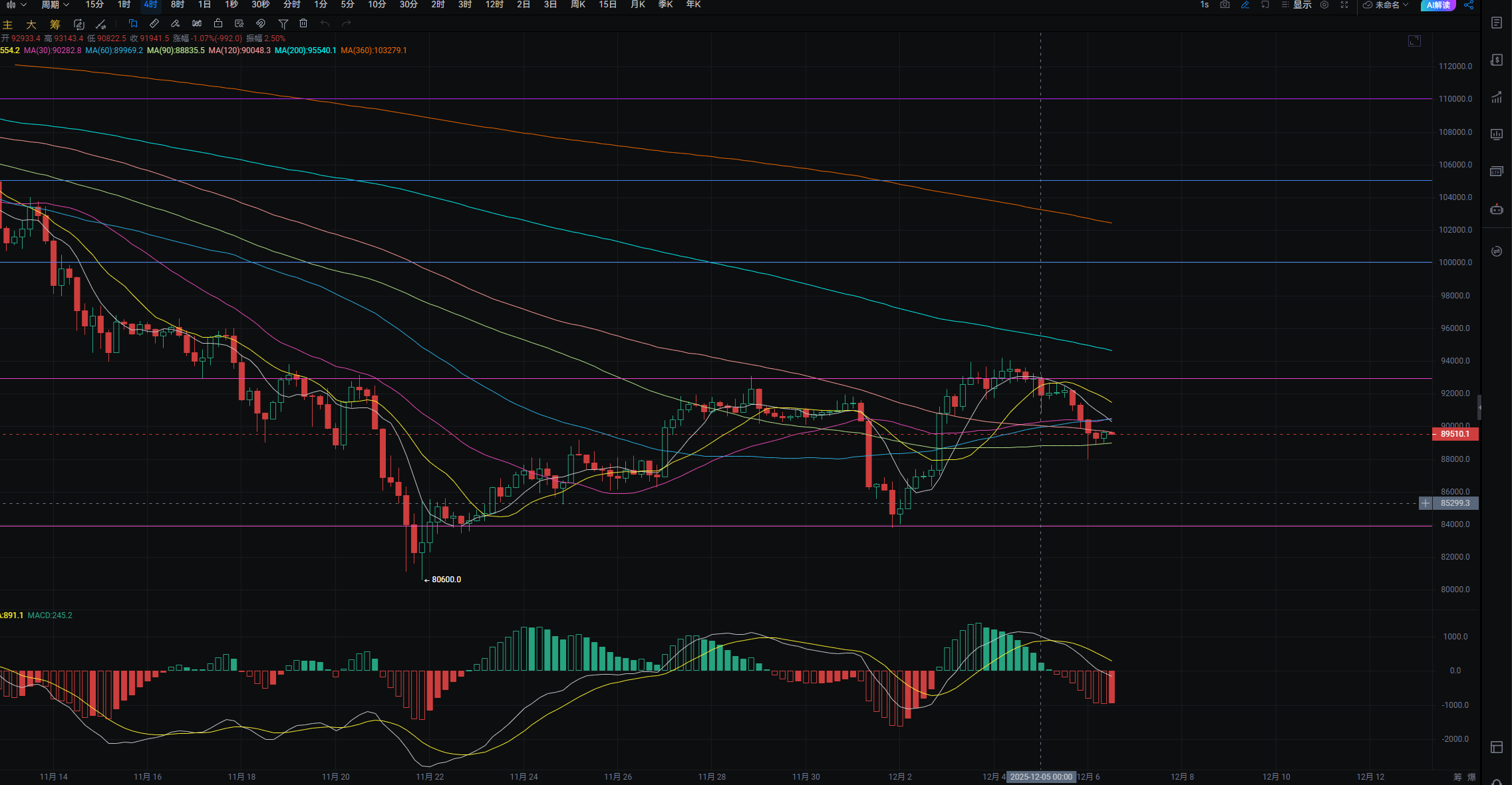 今天下跌的原因,大概看了一下,没有明显利空的信息,而且美股的走势也还算过的去,应该就是情绪的调整,确实明天是周末如果今天情绪不好,周未两天低流量会受罪了,不过下周就是议息会议了,而且12月降息的概率已经很高了,现在市场都开始押注1月会不会降息了,个人估计,最近这段时间应该不会太差,真要闹妖也应该是议息会议以后的事情了。目前已经再次跌破90000点关口,最低插针至88000点附近,现处在89500附近震荡,依旧以高空为主,可在反弹至91000附近进行接空