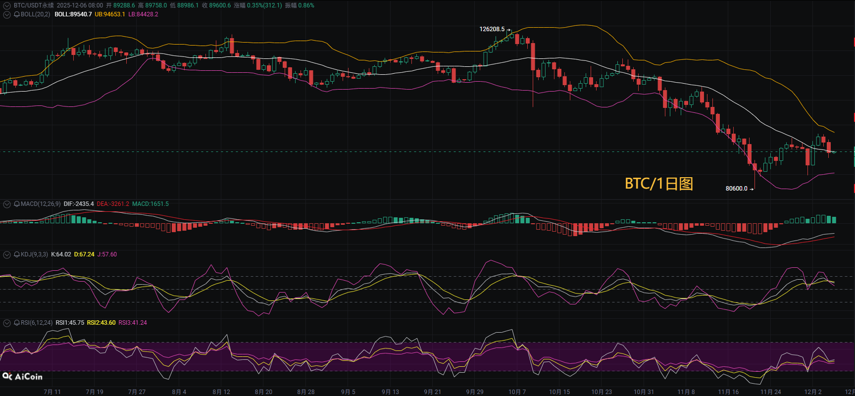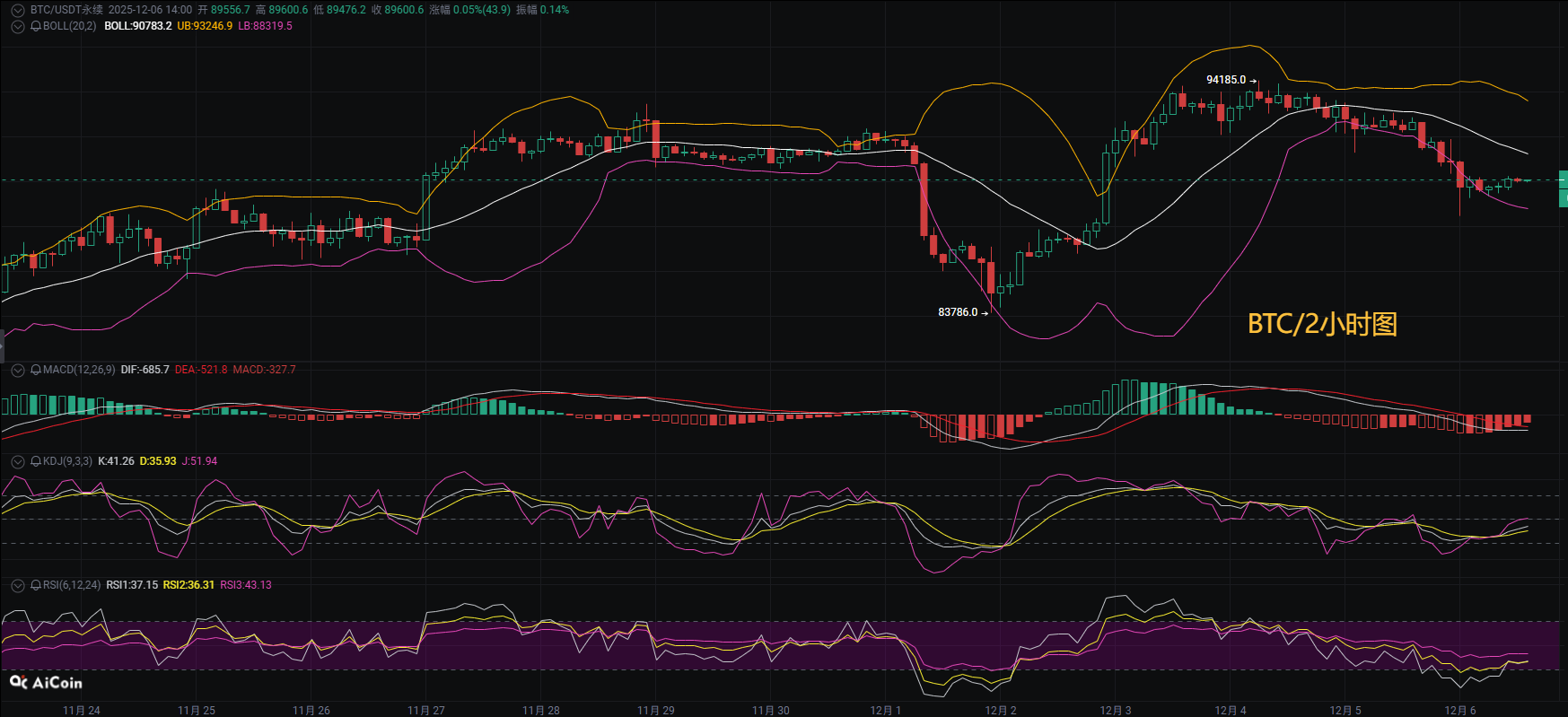 日线级别上,12月5日收出大幅阴线(收盘89330),与前一交易日共同构成空头吞噬形态;同时MACD指标在2小时级别中DIF与DEA于零轴下方间距持续扩大(-690/-522),日线级别柱状体保持负值(-1643),呈现弱势,EMA均线系统显示价格在2小时级别受120日均线(90551)压制,且日线级别EMA7(90325)已向下死叉EMA30(93810),整体趋势偏弱,后续关注9万一线压制,走势反弹没有突破此区域,价格预计还会回撤下方支撑,所以不建议各位盲目追涨。日内行情由强转弱,所以短线操作思路建议空单为主。