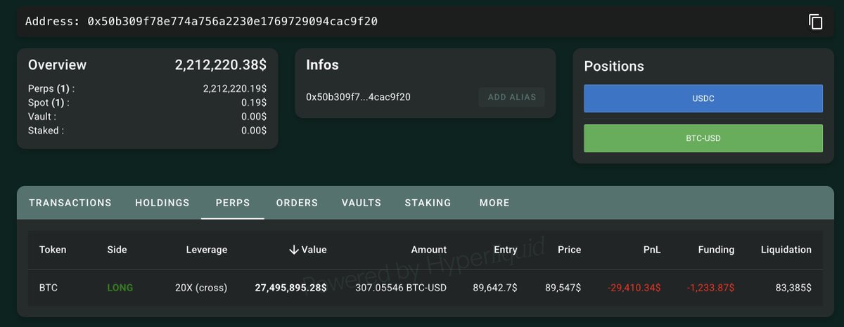 0x50b3 在 $89,642.7 的入场价上开了 20 倍的多头,持有 307 $BTC($27.5M)