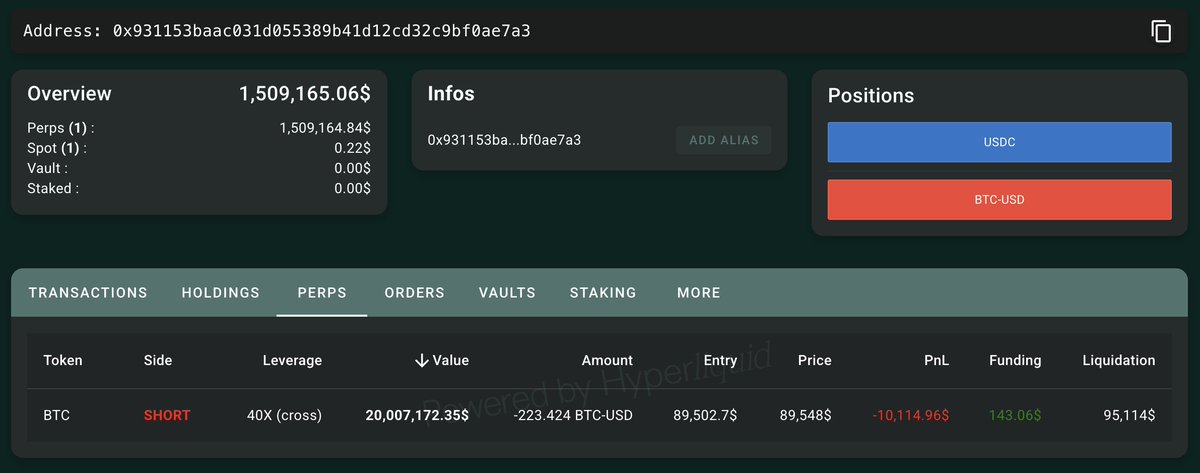 0x9311 在 $89,502.7 的入场价上开了 40 倍的空头,持有 223.4 $BTC($20M)