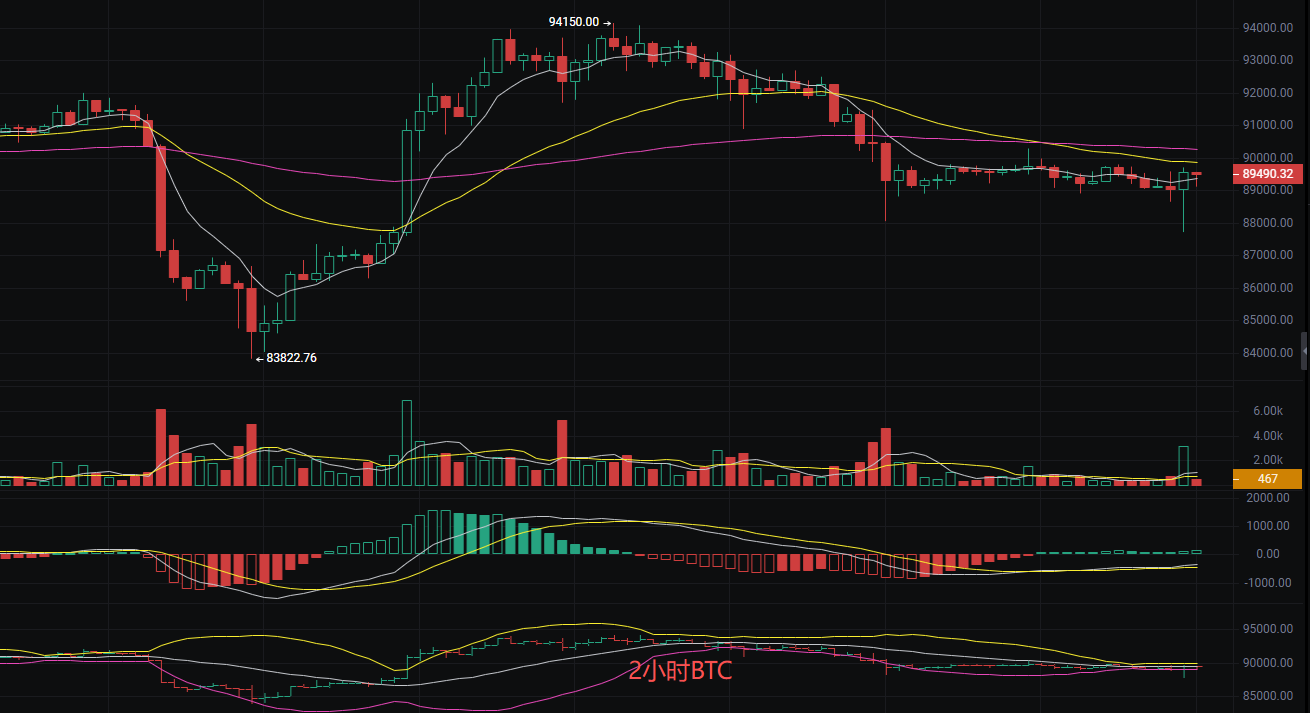 比特币现价89490,丽盈判断大饼BTC明显的下跌趋势,技术面信号显示市场动能减弱,短期内价格可能进一步下探至关键支撑位。具体而言,黄昏之星形态与均线空头排列形成了强烈的看跌共振,均线系统的死亡交叉进一步确认了市场的弱势结构。日线在89000-90000区间震荡,整体呈现高位整理状态。2小时K线上下方均有较强的支撑与压力。MACD2小时有形成金叉迹象,短期可能反弹;日线级别仍然是空头趋势,EMA大趋势依旧偏空,思路上丽盈顺势空为主