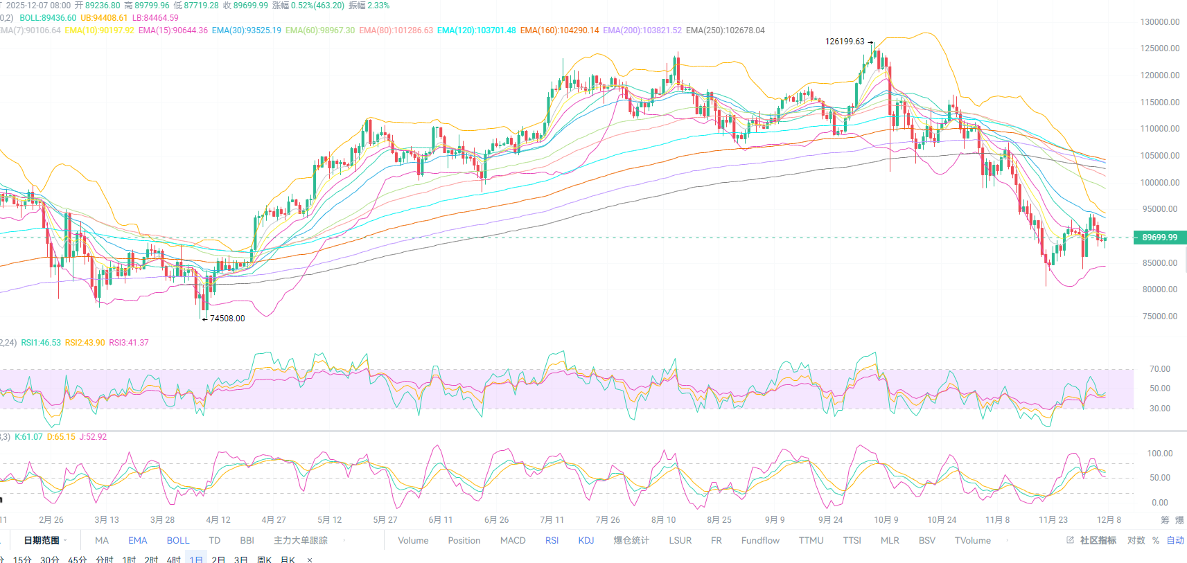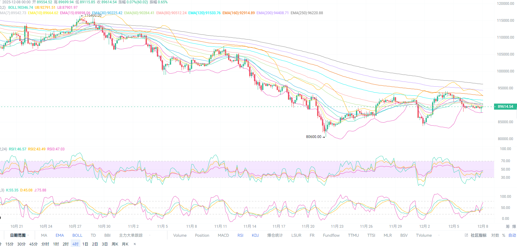 比特币现价89700附近。昨日行情在维持较长时间震荡后再次破位下行插针接近87500,红姐前日就说了行情还要再次下探,这波回踩k线在触及下轨位置刚好形成反弹,目前位于MA90位置正在向上接近中轨与MA30区间,短期可能将继续受阻于此,MACD中红柱缩量,DIF与DEA收口还未成功形成金叉,日内需重点关注,RSI三线上行接近50受阻,KDJ中存在短期上调,思路上红姐建议可以继续保持高空入场!