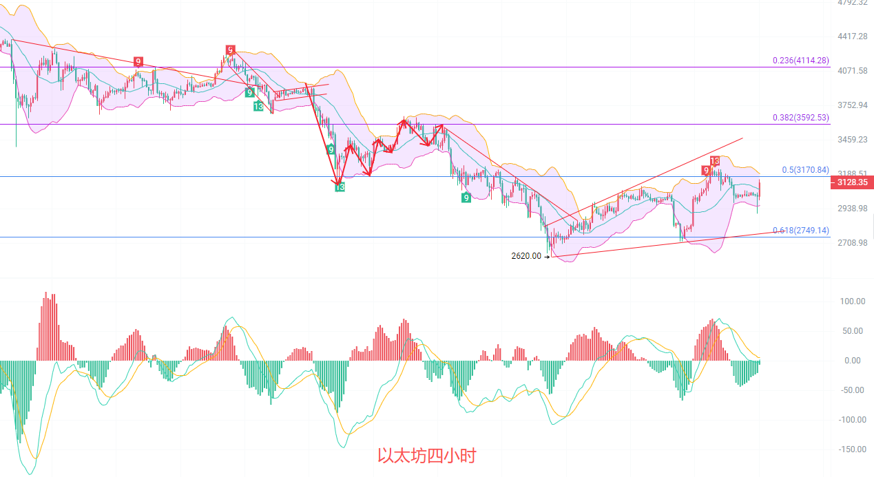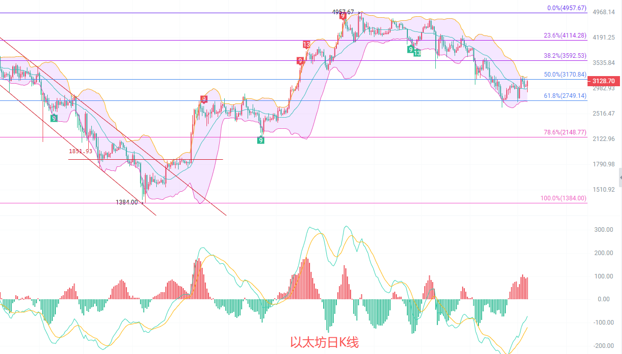 Before the article was published, the daily K-line reached a high of 3150 and a low of 2900. The EMA trend indicator shows a contraction, indicating that the downward momentum has weakened. After the K-line broke the EMA15 trend line at 3050, it began to challenge the EMA30 trend resistance level at 3150 and the key resistance level at 3170. The MACD has formed a bullish trend with increasing volume, and the DIF and DEA are expanding upwards from a low position. The upper Bollinger Band is at 3222, and the middle band is at 2980. The daily strategy is mainly bullish.
