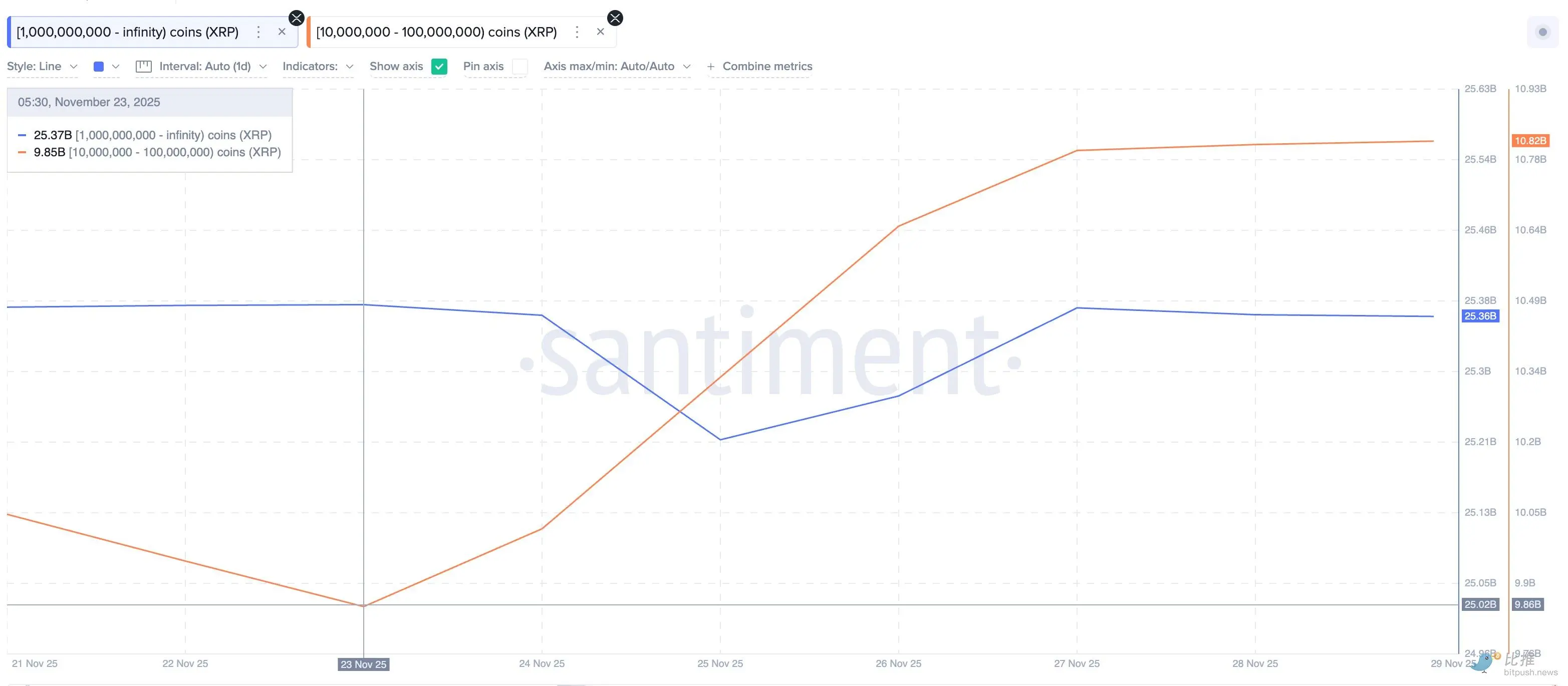 - 持有1亿-10亿枚XRP的地址净增加9.7亿枚