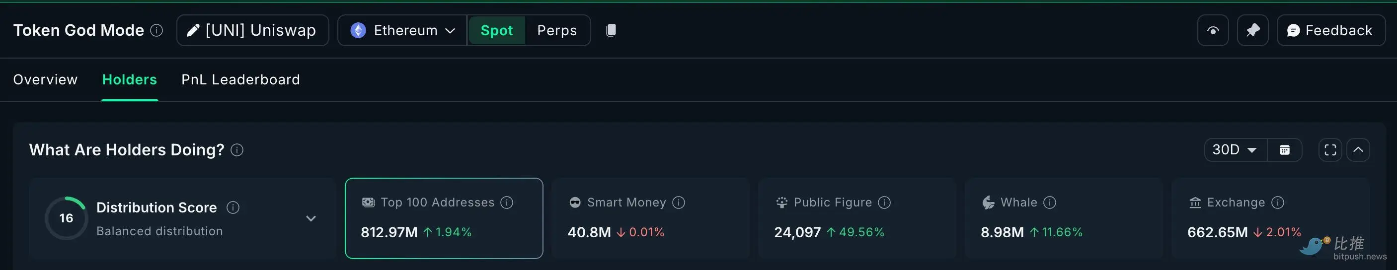 UNI: 过去一周巨鲸新增约80万枚(价值近$500万美金),费用开关投票通过后,排名前 100 的地址共持有 898 万枚 UNI,显示出强劲的吸筹势头,而交易所的供应量却在持续减少。