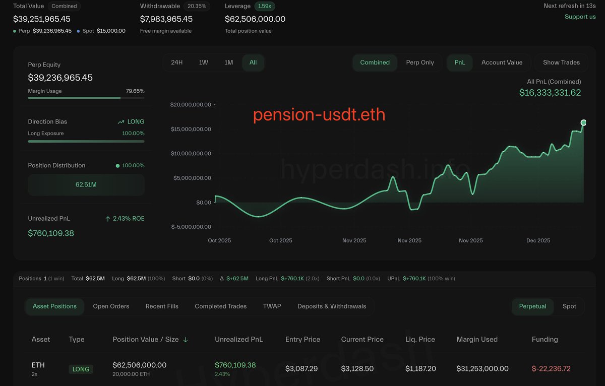 pension-usdt.eth, with $16.3M in total PNL, is long 20,000 $ETH($62.5M).