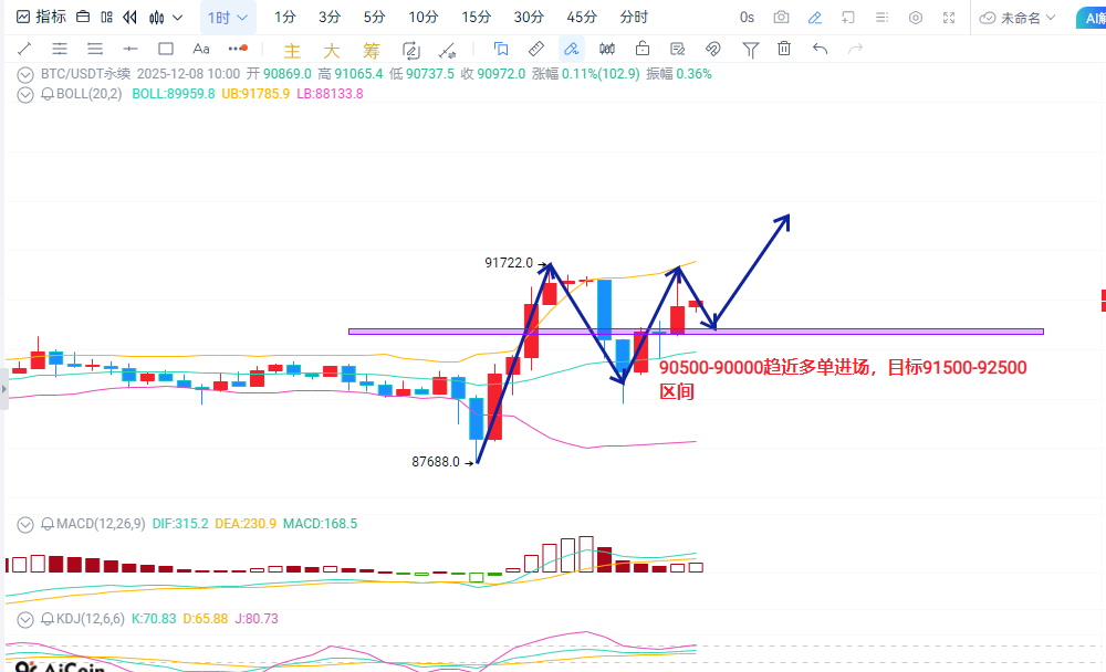 建议比特币90500-90000附近多单进场,目标91500-92500,破位看92900-93200区间