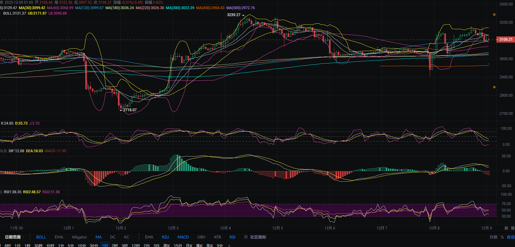 The support at the middle track of the 4-hour chart is strong, but KDJ has already turned down from a high position and is forming a crossover. If it breaks the middle track, we can see the MA60 position. The current Bollinger Bands channel continues to move upward, with the upper band rising, and the lower space may not be very large. The lower track position and the 3000 level may form key support, with the bottom defense still at the MA120 position!