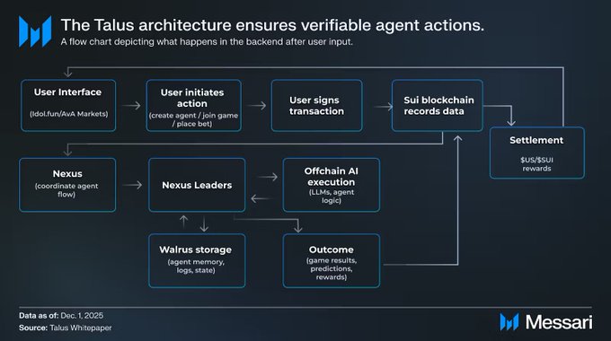 Talus 的核心理念是“全链上AI”,即将AI 代理从逻辑、状态到决策步骤,全部写入智能合约,在链上直接执行。在此架构下,任何人都可以验证AI 代理的历史行为和决策路径,无需信任第三方。
