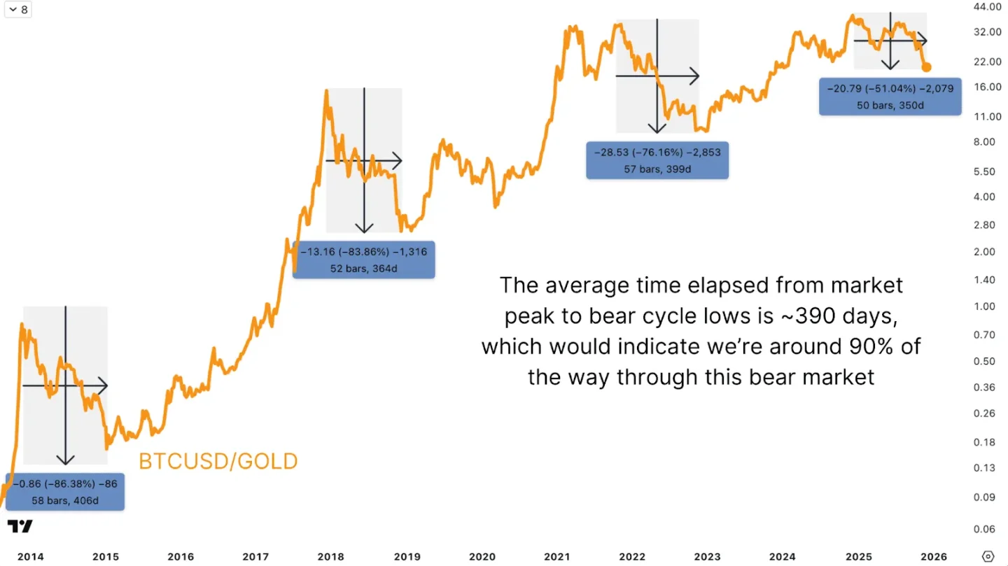 比特币兑黄金的走势与兑美元的走势截然不同。比特币在 2024 年 12 月见顶后已下跌超 50%,而以美元计价的峰值出现在 2025 年 10 月,远低于前一年高点。这种差异表明,比特币可能早已进入熊市,且时间比多数人认为的更久。回顾以黄金计价的比特币历史熊市周期,可以发现当前回调可能已接近关键支撑区域。