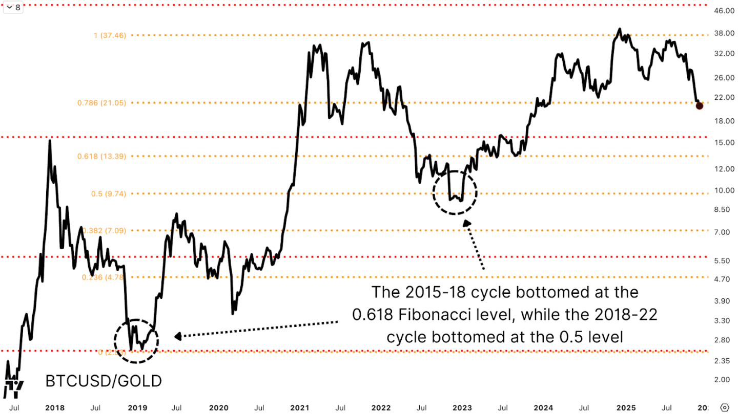 从上轮熊市低点到本轮牛市高点,0.618 斐波那契水平对应每比特币约 22.81 盎司黄金,0.5 水平对应 19.07 盎司。当前价格正处于这两者之间,从购买力角度看可能形成理想的积累区。
