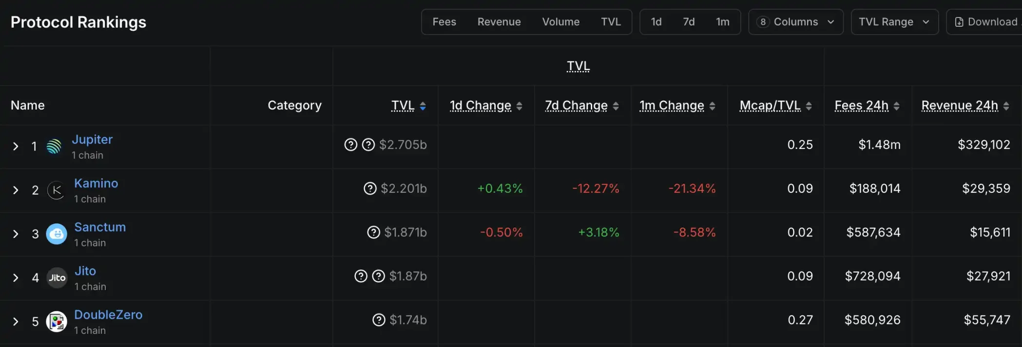Comment from Odaily: Defillama data shows that Jupiter and Kamino are currently the two protocols with the highest TVL in the Solana ecosystem.