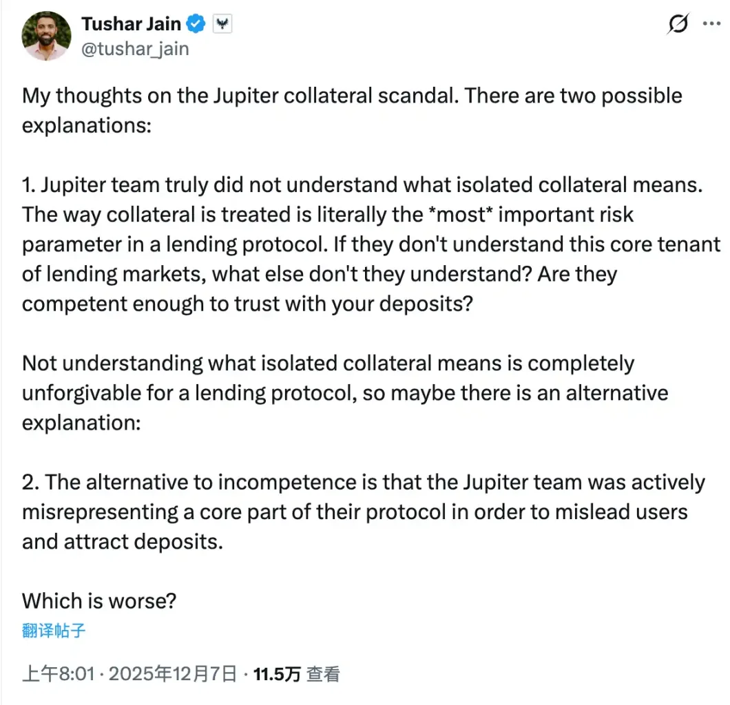 Tushar stated: "There are two possible explanations for the controversy surrounding Jupiter Lend. One is that the Jupiter team truly does not understand the meaning of isolated collateral. The handling of collateral is the most important risk parameter in a lending protocol. If they do not even understand this core principle of the lending market, what else do they not understand? Can their professional capabilities be trusted to safely deposit funds? For a lending protocol, not understanding the meaning of isolated collateral is completely unforgivable. The other possibility is that the Jupiter team is not incompetent but is actively misrepresenting the core parts of their protocol to mislead users and attract deposits."