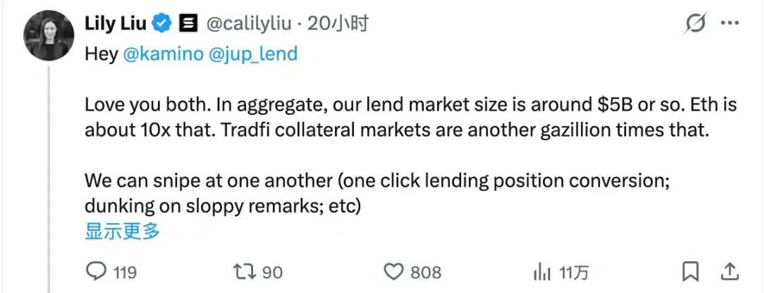 Yesterday afternoon, Solana Foundation President Lily Liu posted on the X platform, calling on both projects to reconcile, stating: "Love you both. Overall, our lending market is currently about $5 billion, while the Ethereum ecosystem is about ten times that size. As for the traditional finance collateral market, it is countless times larger than this number. We can choose to attack each other, but we can also choose to look further— first work together to capture market share from the entire crypto market, and then jointly march into the vast world of traditional finance.