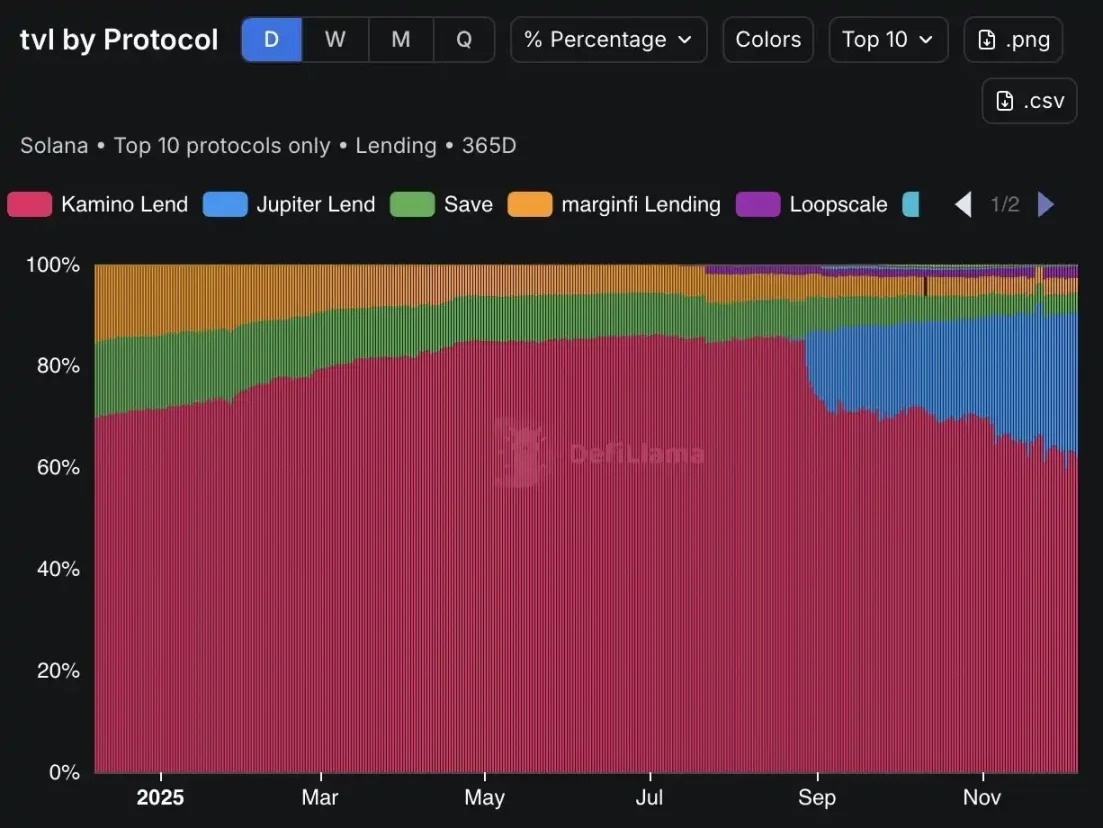 On one hand, Kamino (red in the chart below) had long held the position of the leading lending protocol in the Solana ecosystem, but since the launch of Jupiter Lend (blue in the chart below), it has captured a significant market share, becoming the only entity currently capable of challenging the former.