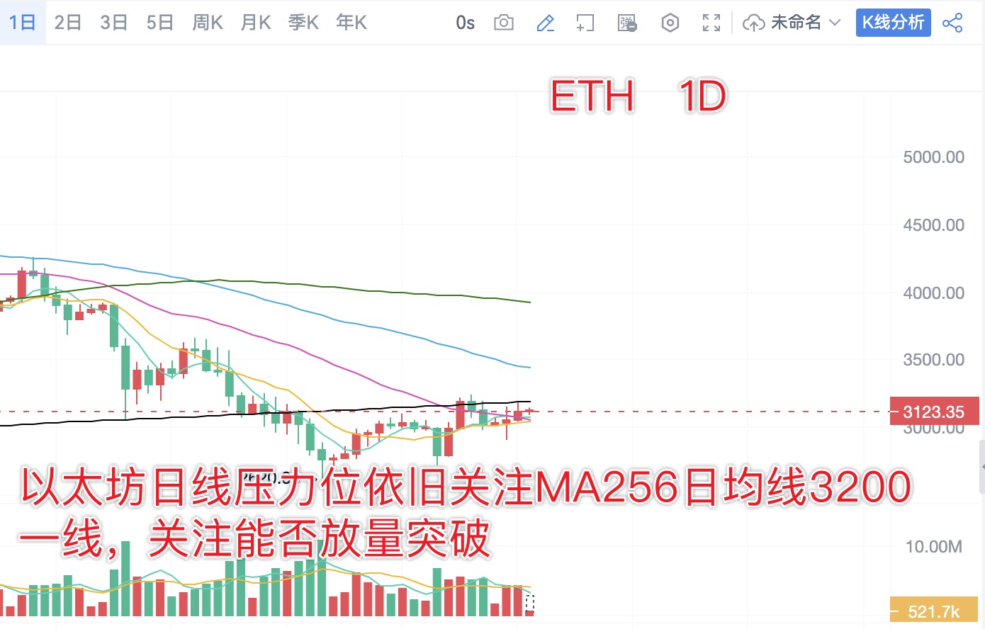 以太坊从日线图上看,日线继续受MA256日均线3200一线压制,此一线还将是短线的关键压力位,可做此一线的突破多单或小止损空单,第二压力位则关注4小时MA256日均线3250,支撑位3100/3030即可。
