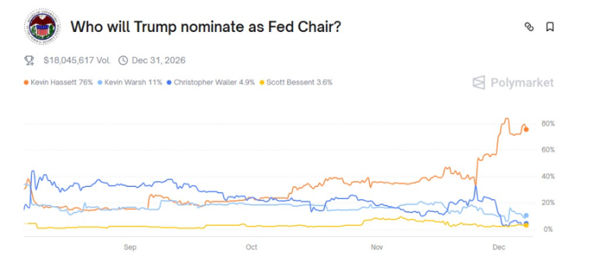 鲍威尔的美联储主席八年任期将于明年五月结束,市场普遍预期他将被特朗普的首席经济顾问凯文·哈塞特取代。特朗普上周也暗示了这一点,称他将人选名单缩小至一人,随后在白宫的一场活动中介绍哈塞特为「潜在的美联储主席」。