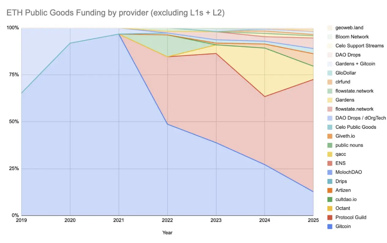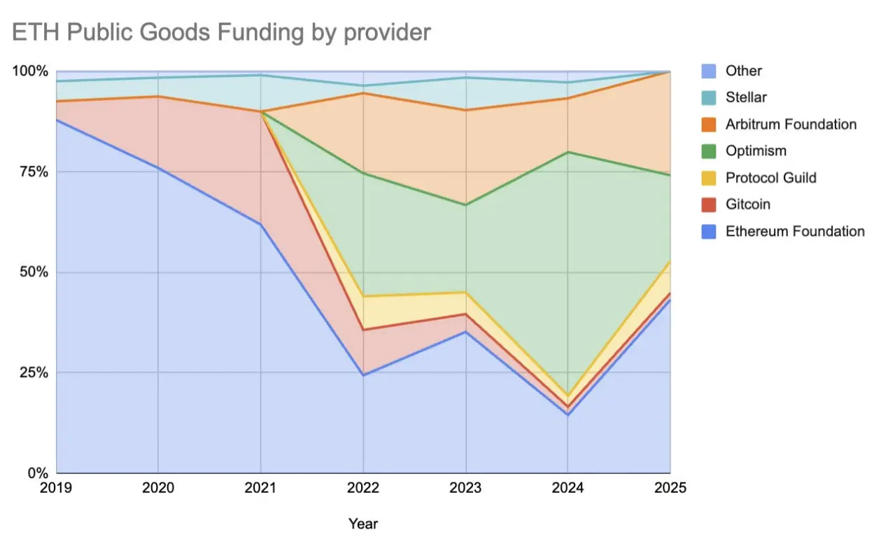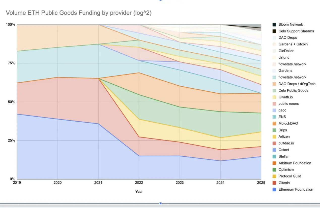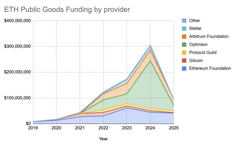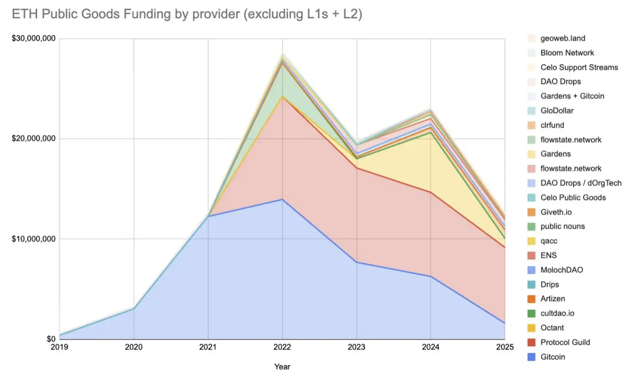总体而言:以太坊公共物品的资金并非消亡,而是在蜕变。Vibes 时代的外衣正在褪去,在其下,一个更持久、更机制化、可扩展的 PGF 生态系统正逐渐成形。